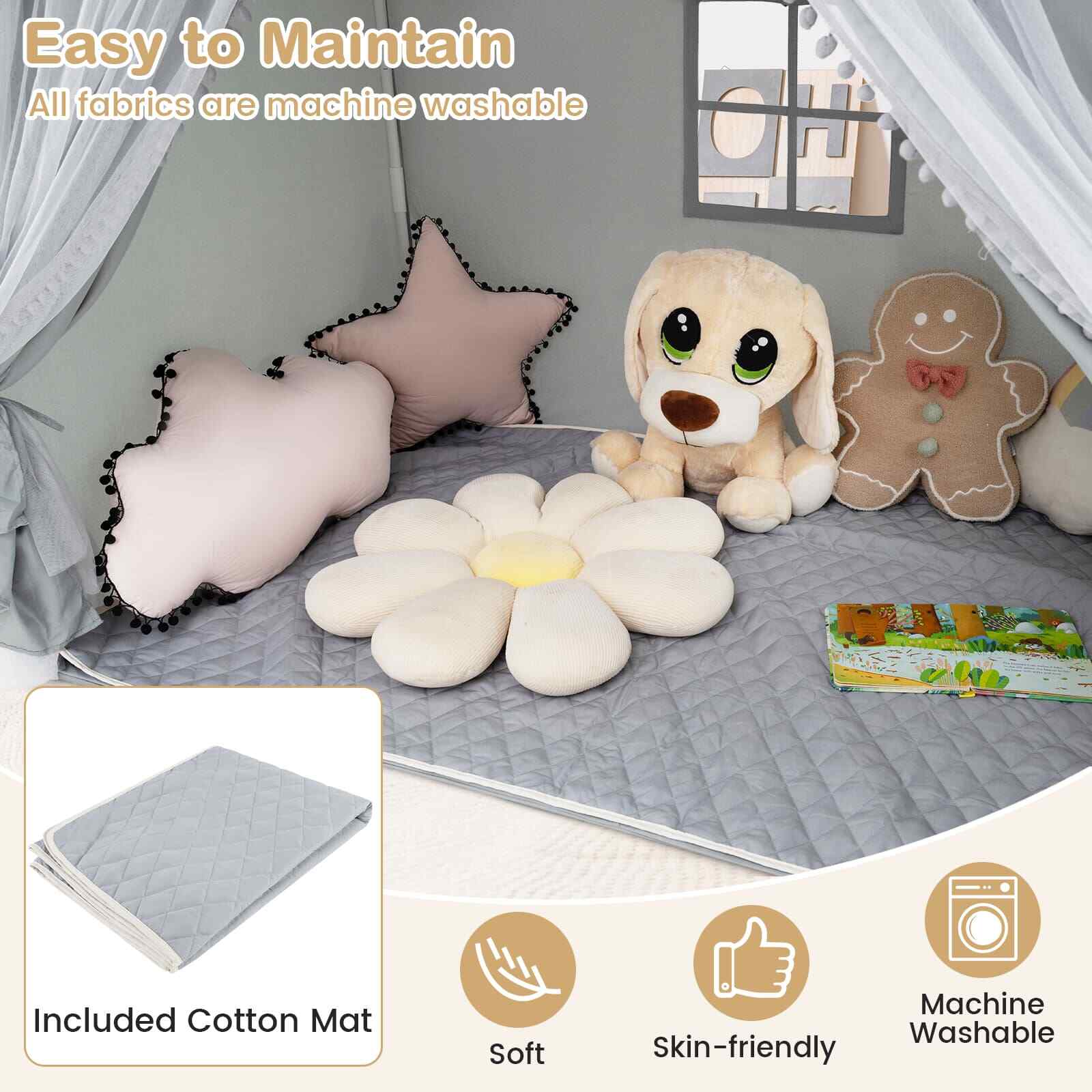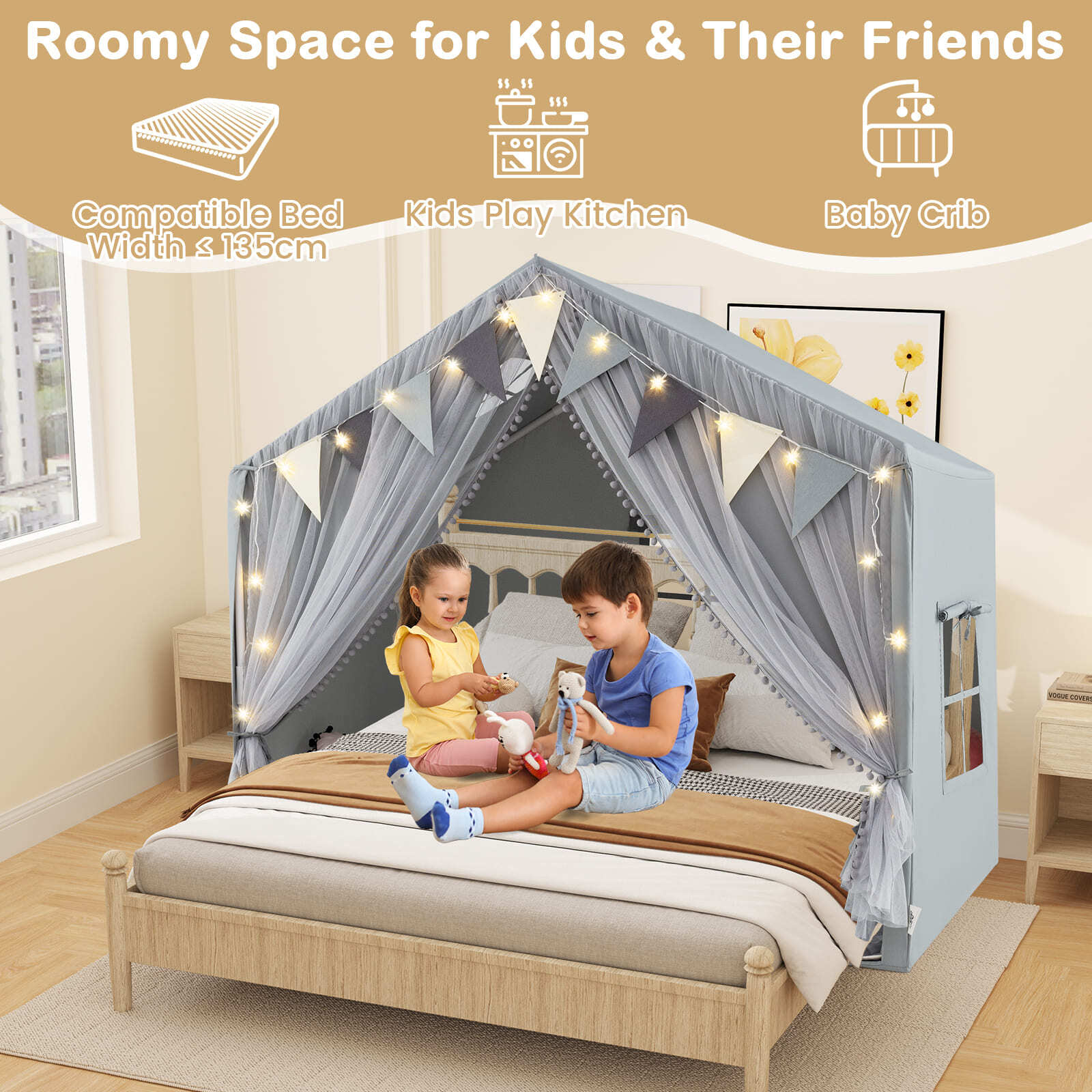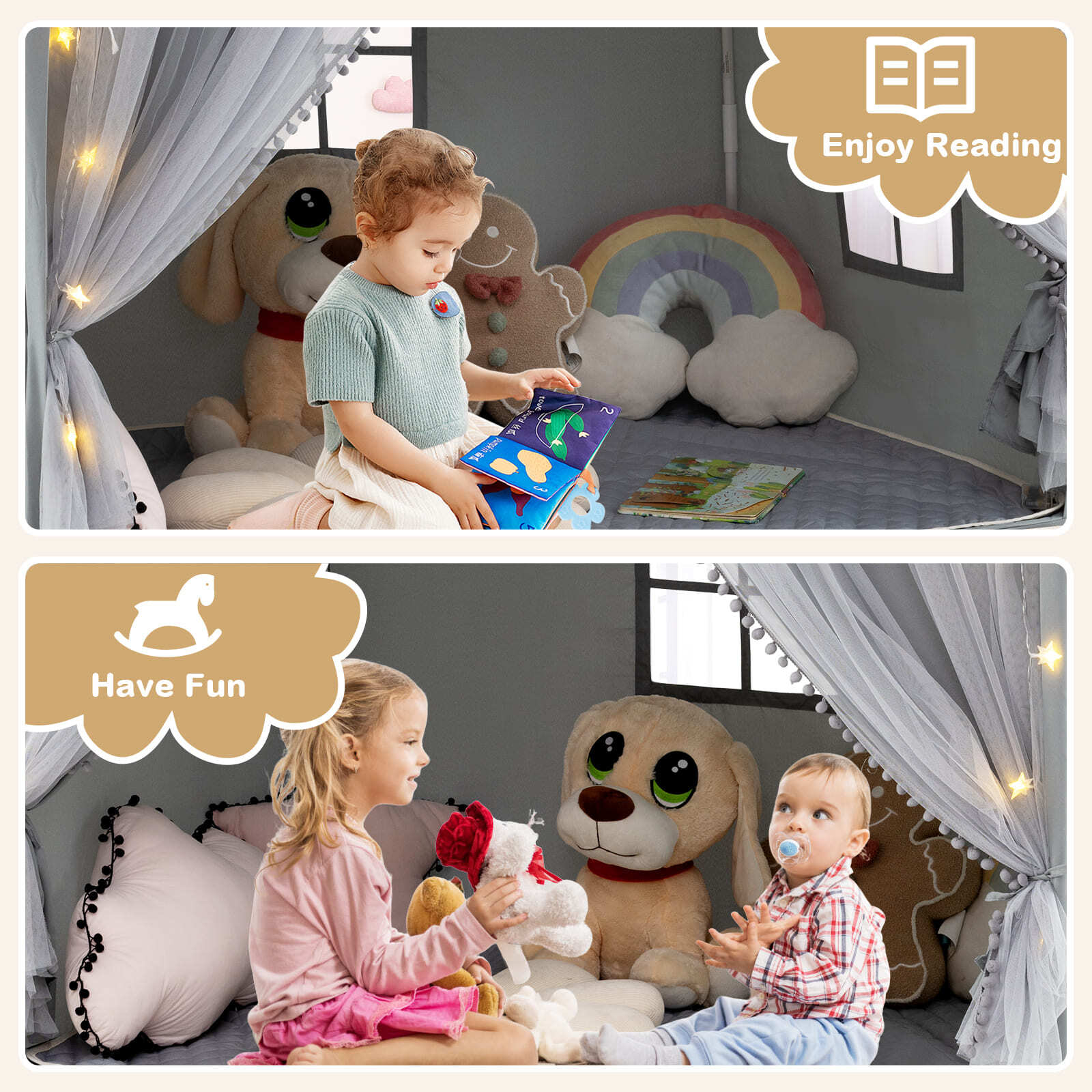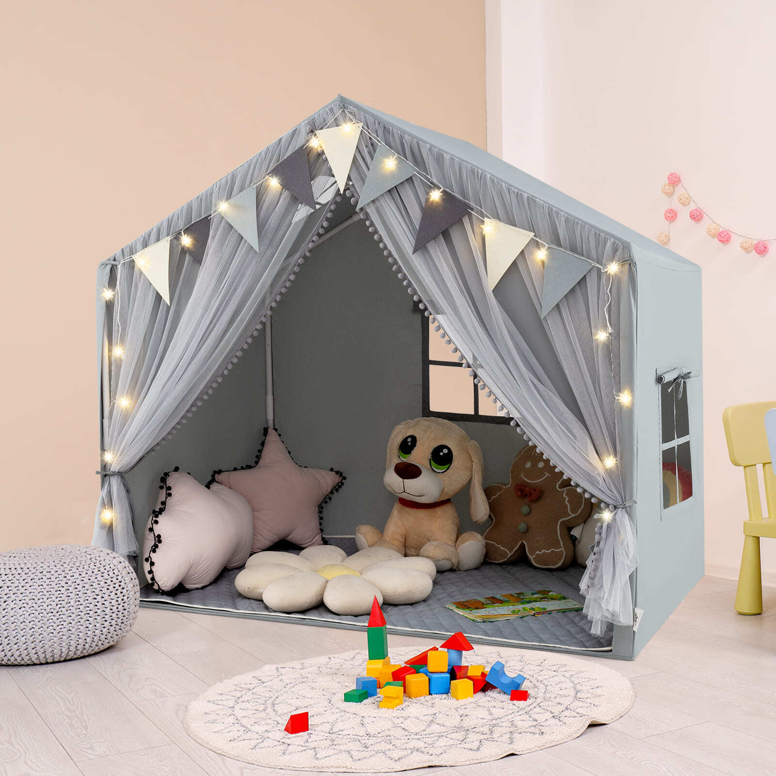 3-4 Kids Large Play Tent House Kids Play Tent w/Star Lights-Grey
