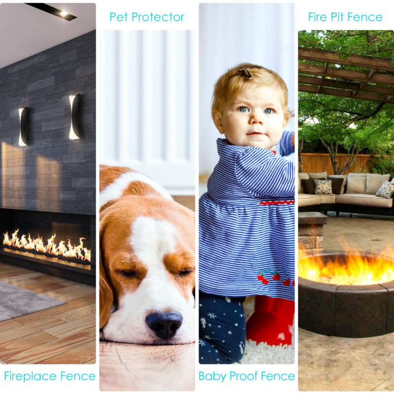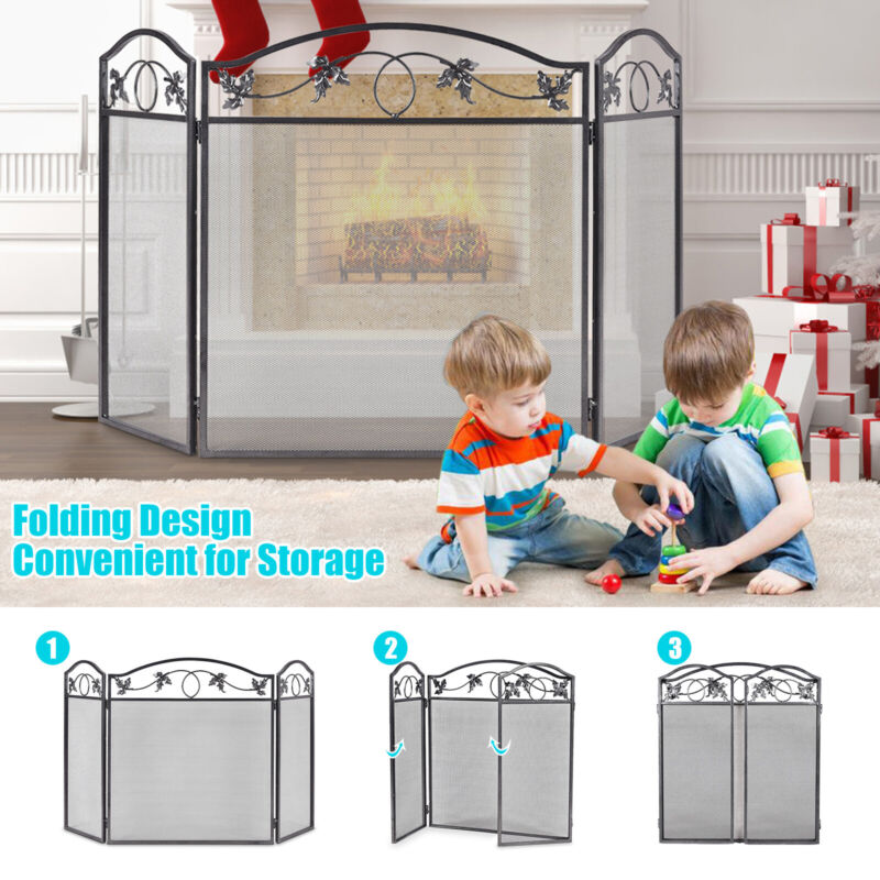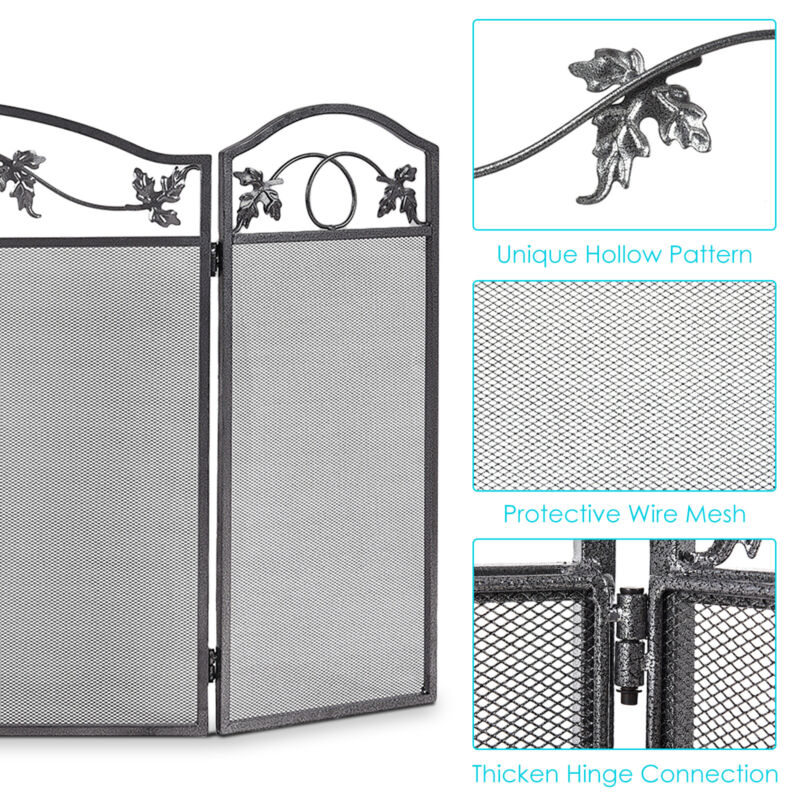 3 Panel Foldable Fireplace Guard Fire Screen Protector w/ Leaves Pattern and Met