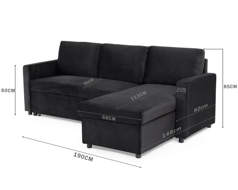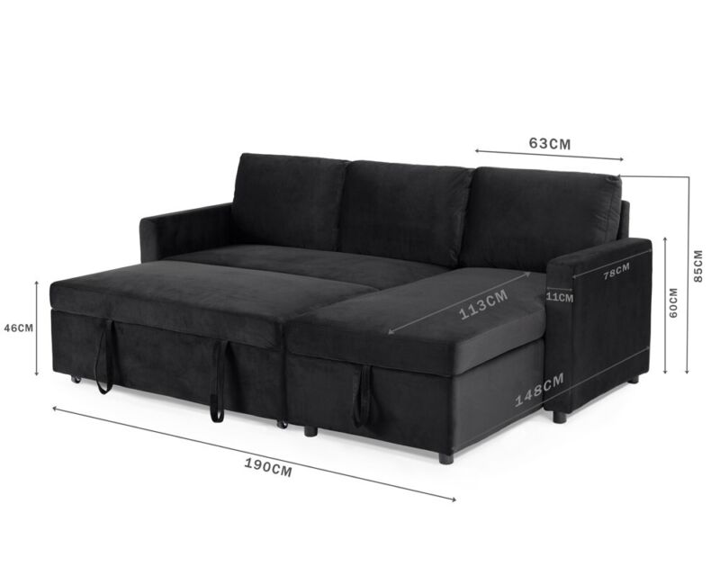 3 Seater Sofa Black Pull Out Sofa Comfy Cushions Right Hand Chase Sofabed
