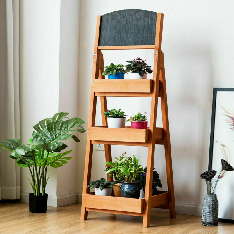 3-Tier Flower Pot Stand Wooden Outdoor Garden Ladder Plant Rack W/ Blackboard