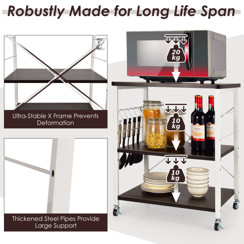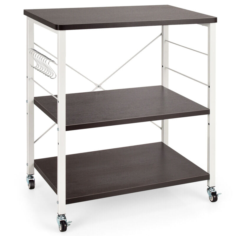 3 Tier Rolling Kitchen Baker's Rack Adjustable Utility Serving Cart W/ 10 Hooks