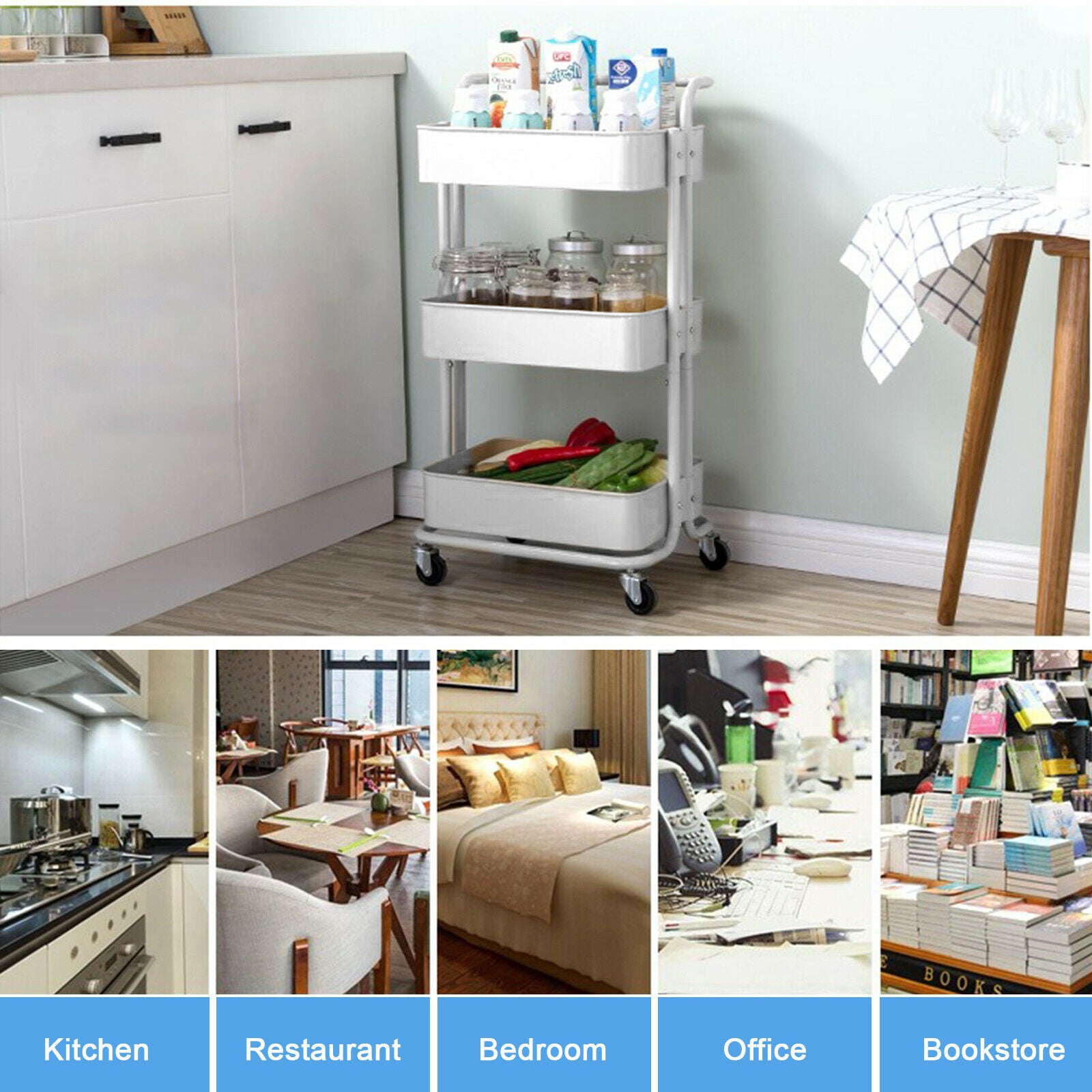 3 Tier Slim Kitchen Storage Trolley Cart Rack Tray Shelf Rolling Wheel W/ Handle