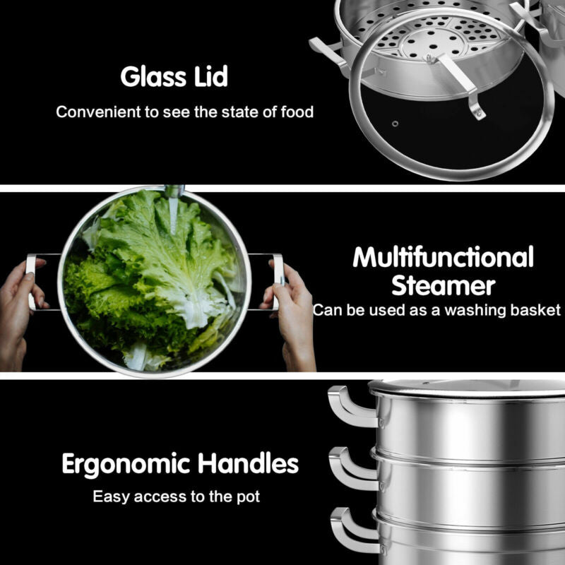 3 Tier Stainless Steel Steamer Set Kitchen Cooking Induction Steamer Pans W/ Lid