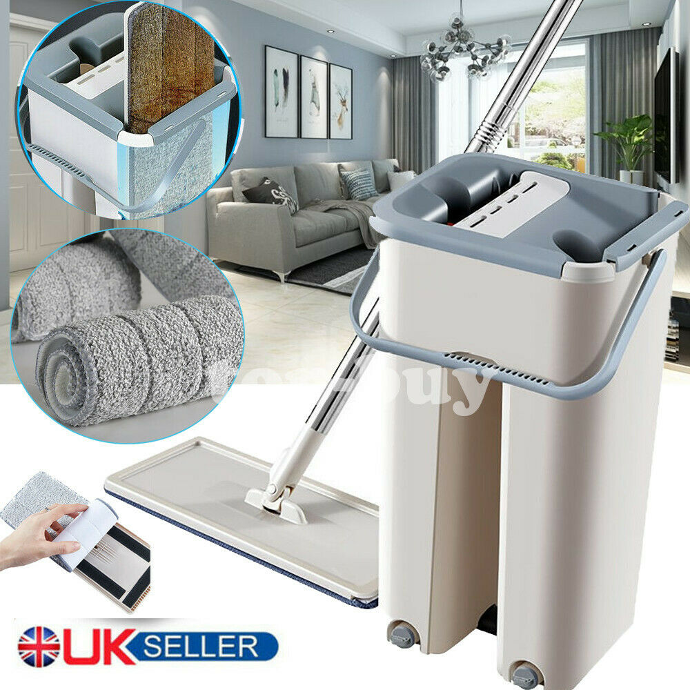 360° Flat Squeeze Microfiber Mop & Bucket Set Home Floor Tiles Cleaning +2 Pads