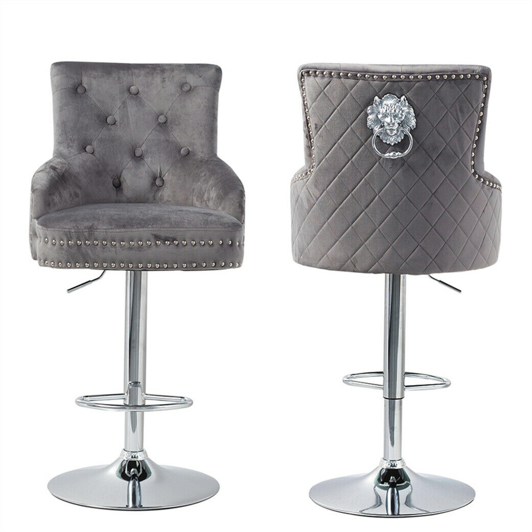 360° Swivel Grey Velvet Bar Stool Gas Lift w/Lion Head Door Knocker &Tufted Back