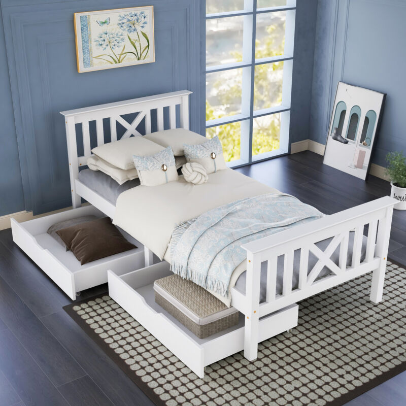 3ft Single Bed Solid Pine Wooden Storage Bed Frame 2 Drawers 90x190 cm White
