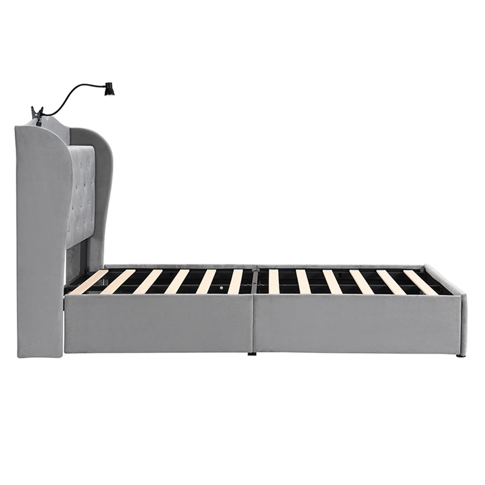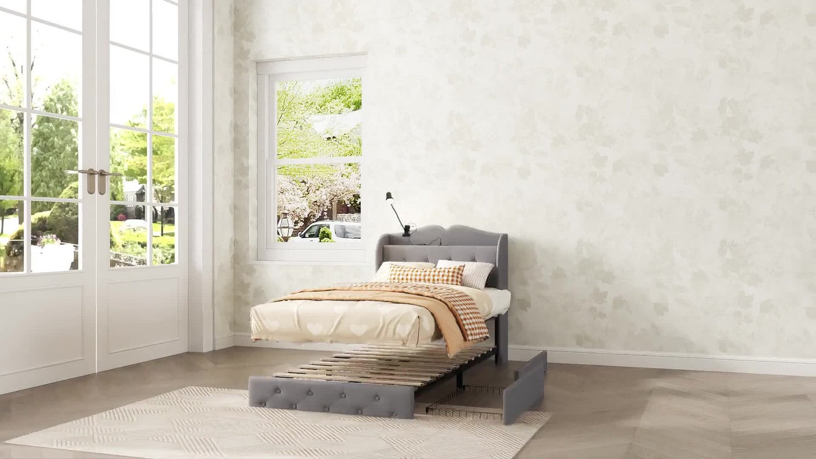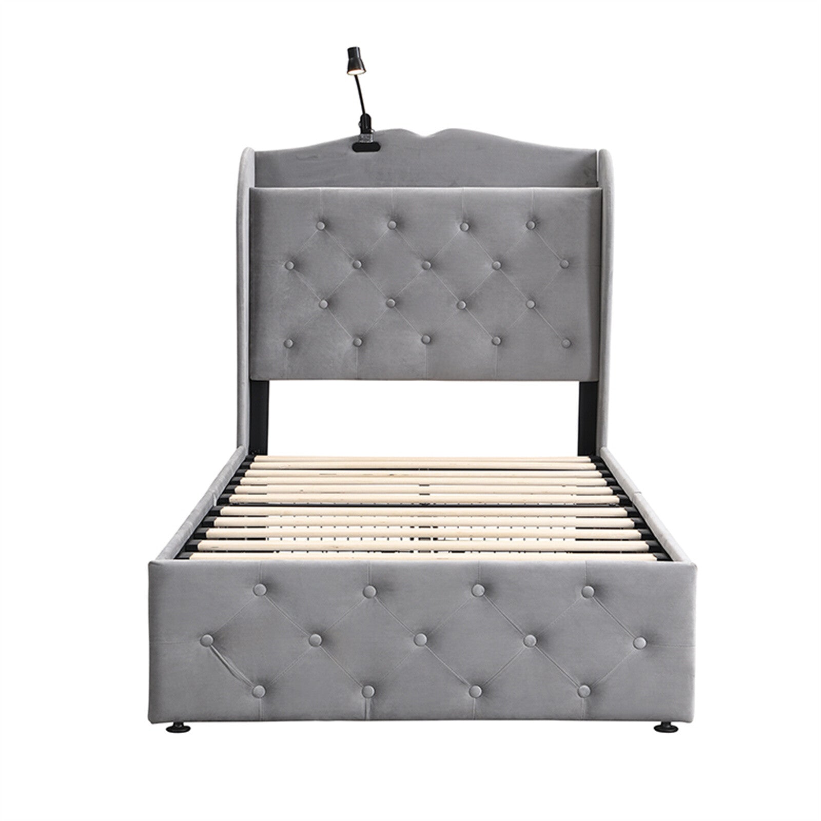 3ft Single Bed Upholstered Storage Bed Frame With Headboard, Lamp and 4 Drawers