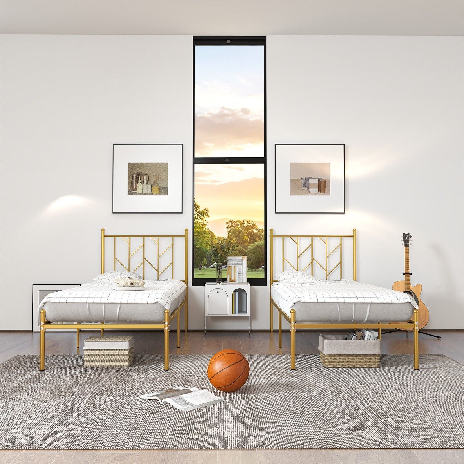 3FT Single Metal Bed Frame Heavy-duty Slatted Platform Bed w/Headboard-Golden