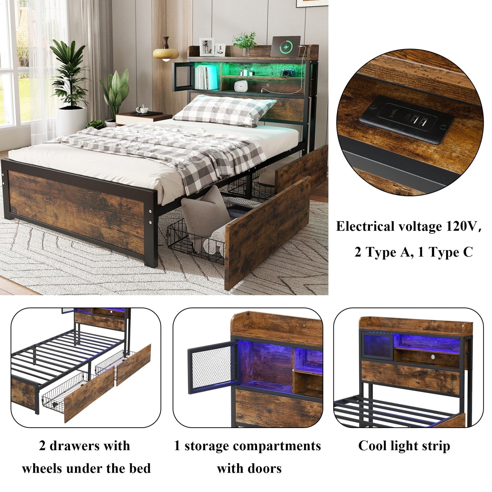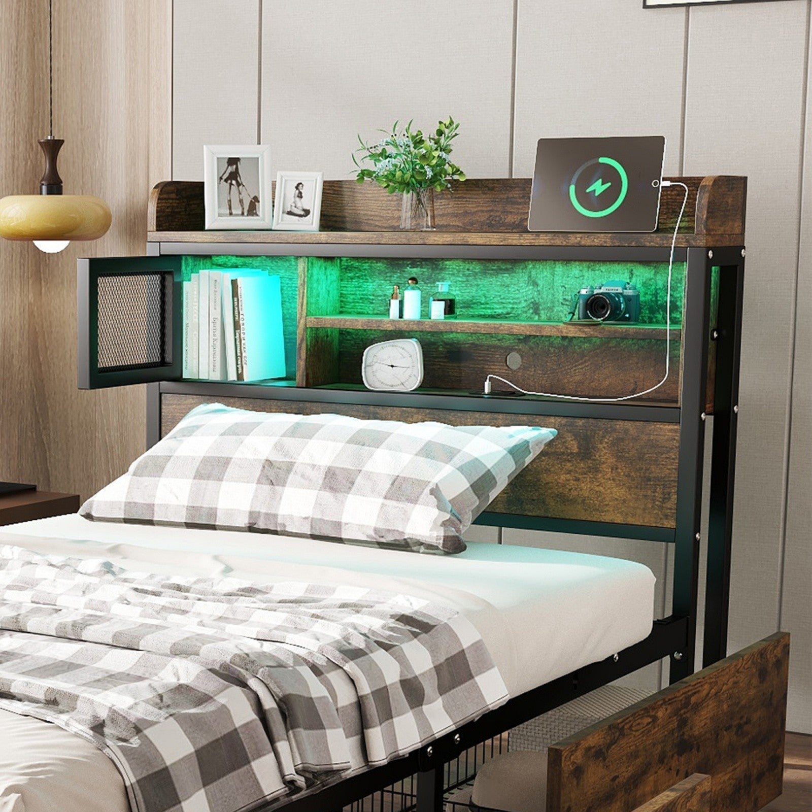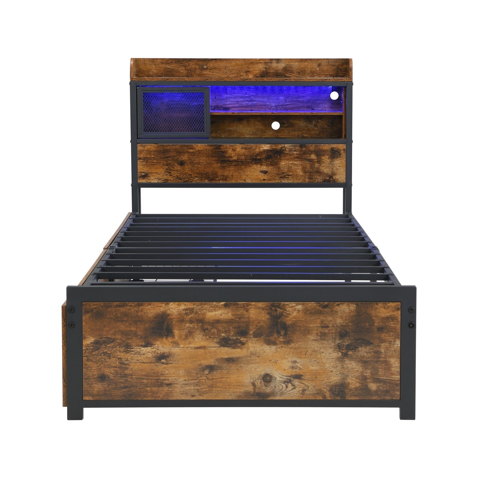 3ft Single Metal Bed Frame w/ LED, Charging Station, Storage Headboard & Drawers
