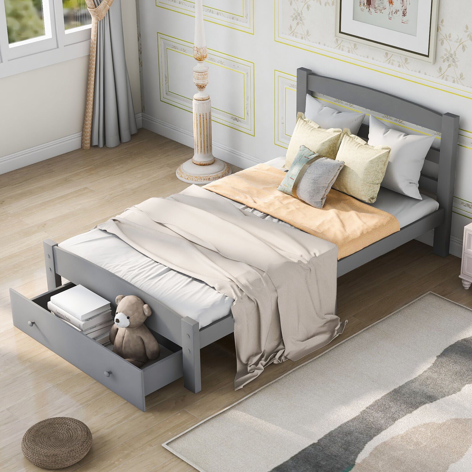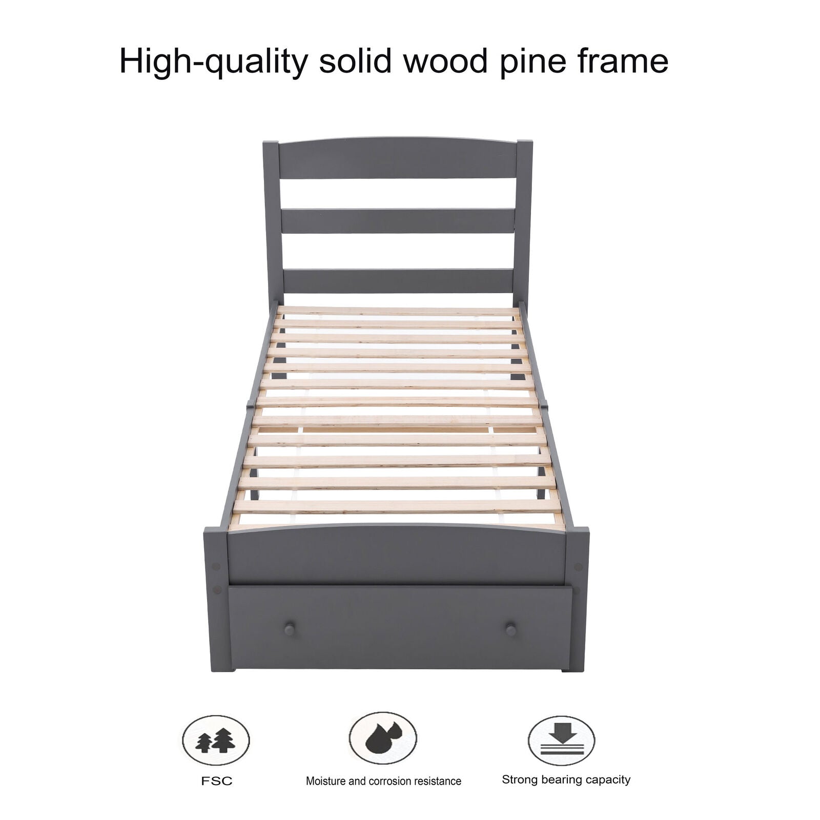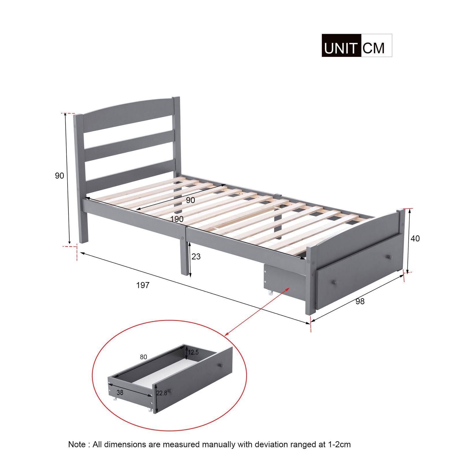 3FT SINGLE SIZE WOODEN BED WITH STORAGE DRAWER SOLID PINE WOOD BED FRAME GREY