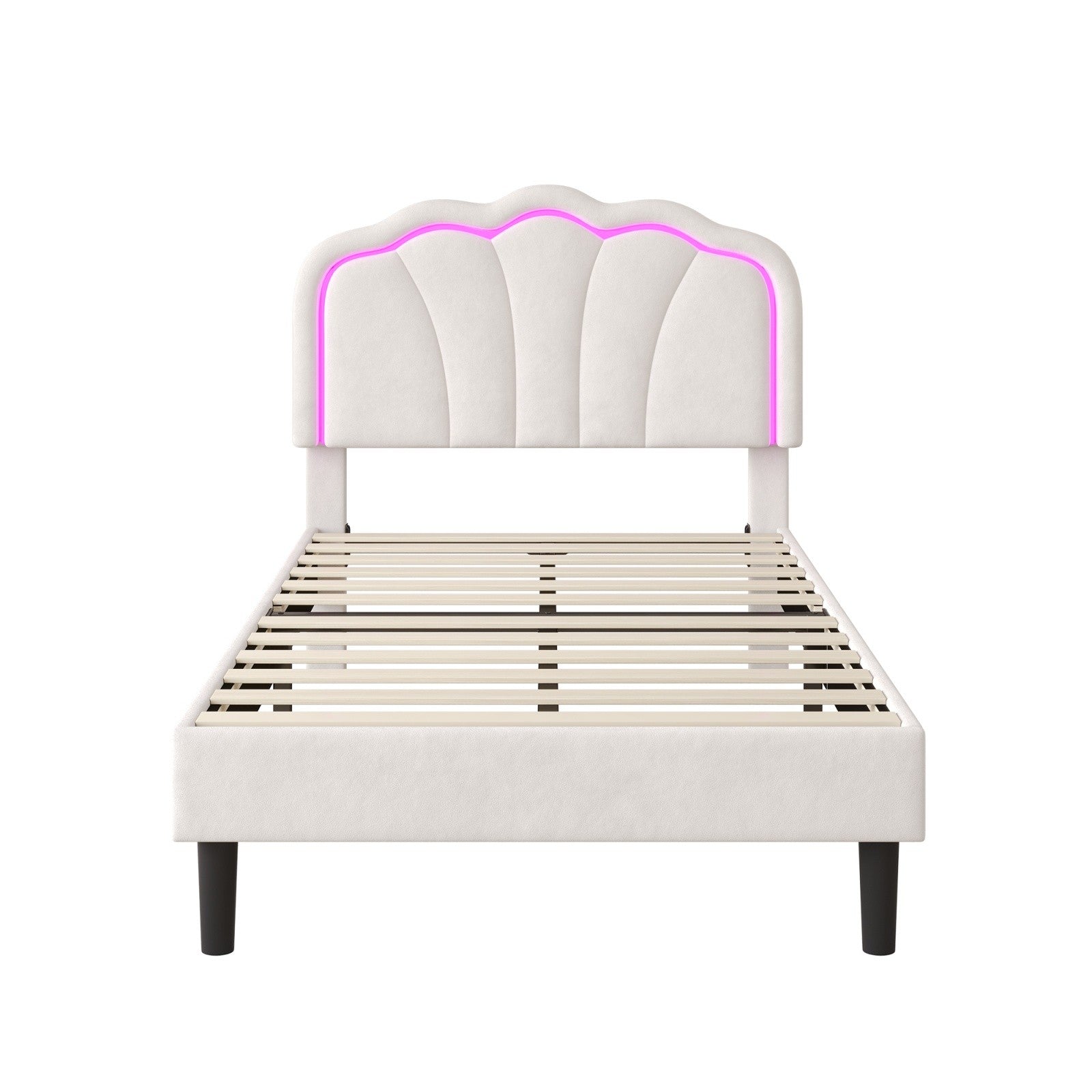 3ft Single Velvet White Upholstered Bed Frame w/ LED Headboard & Solid Wood Slat