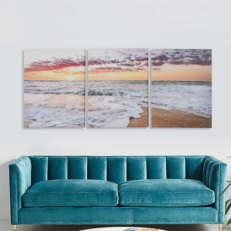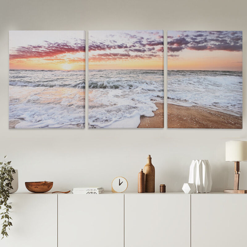 3PC Seascape Sunset Art Print Cream Orange Sky Beach Unframed Split Picture Deco
