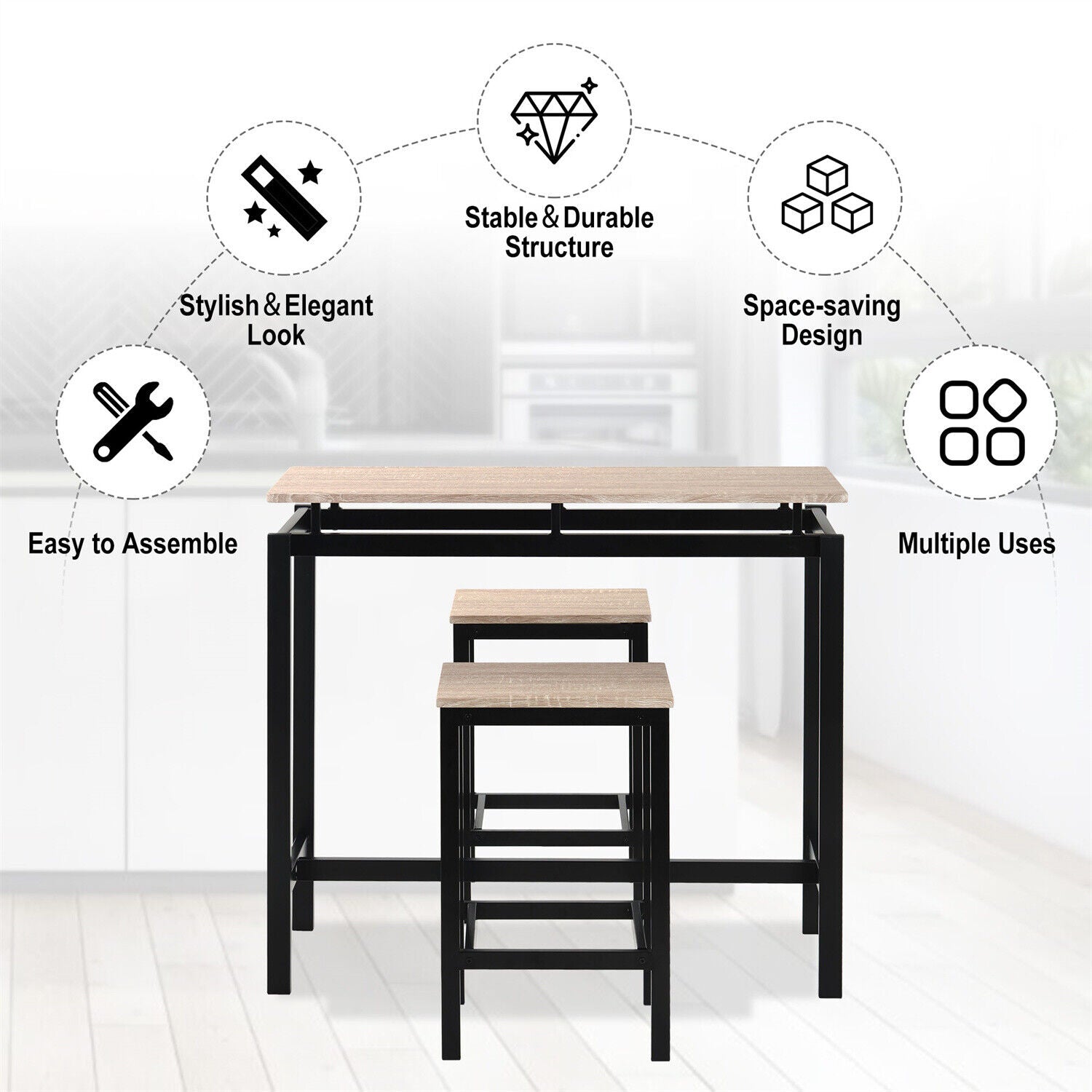 3PCS High Table & Chair Set Bar Kitchen Dining Room Breakfast Furniture 2 Stools