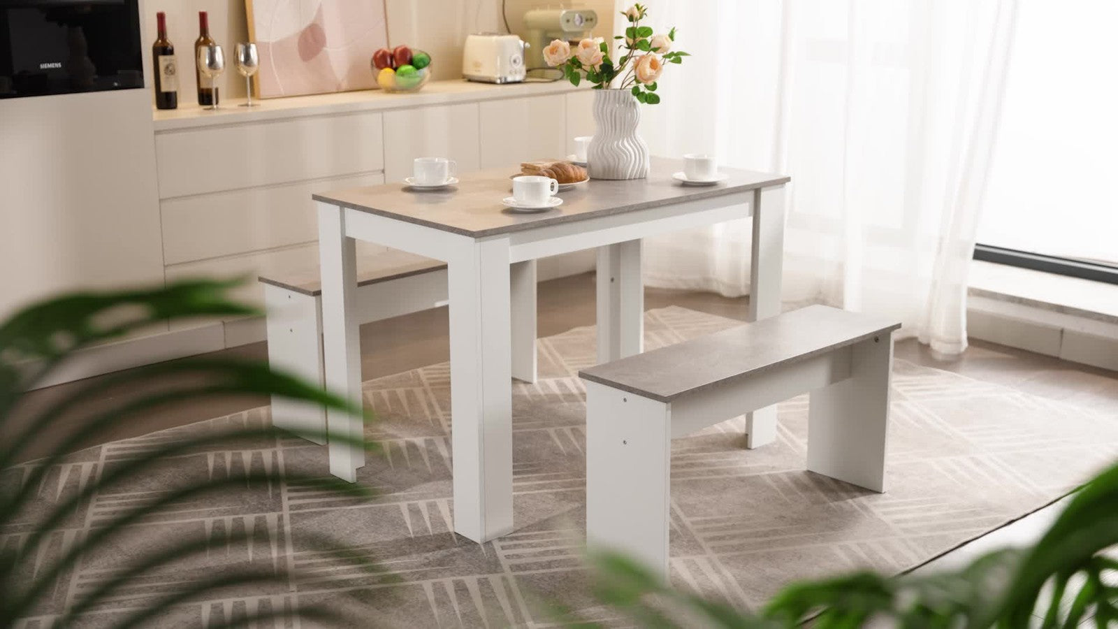 3Pcs Marble Look Dining Table and Chairs Set 2 Benches Kitchen Furniture Grey