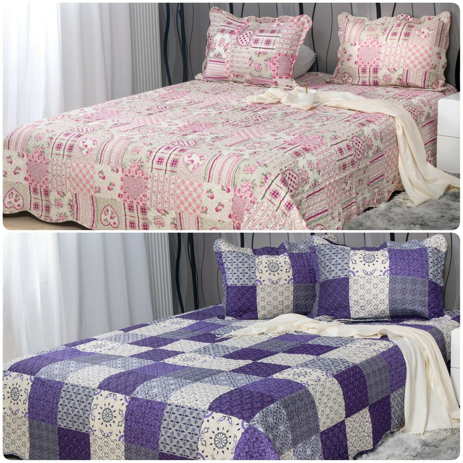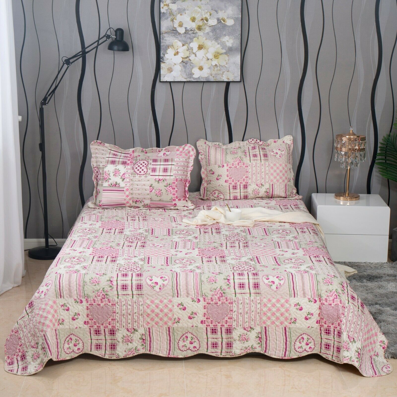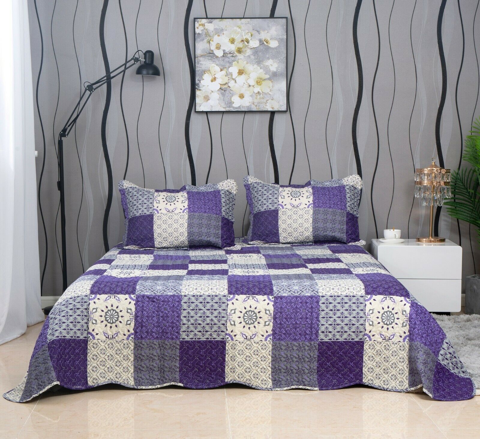 3PCs Patchwork Quilted Bedspread Printed Bed Throw Comforter with Pillow Shams