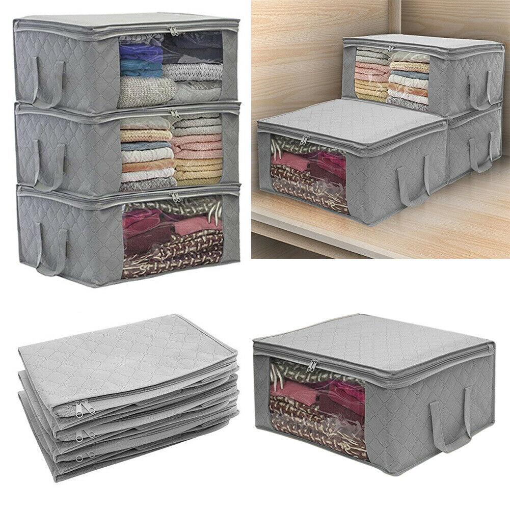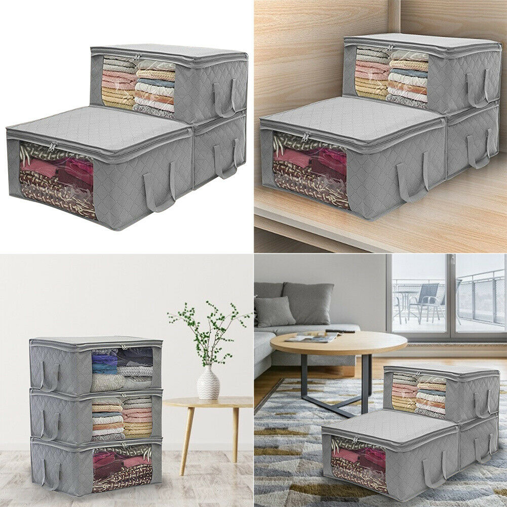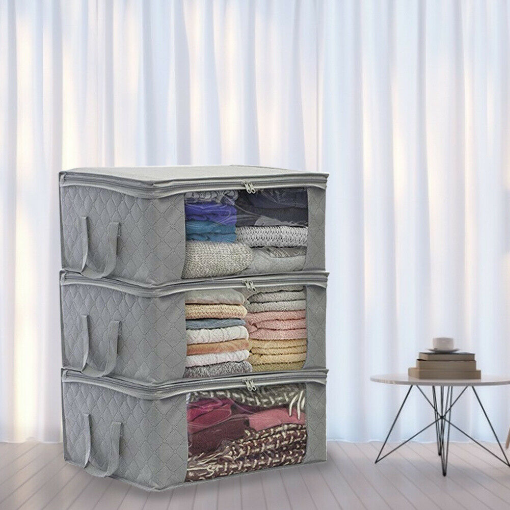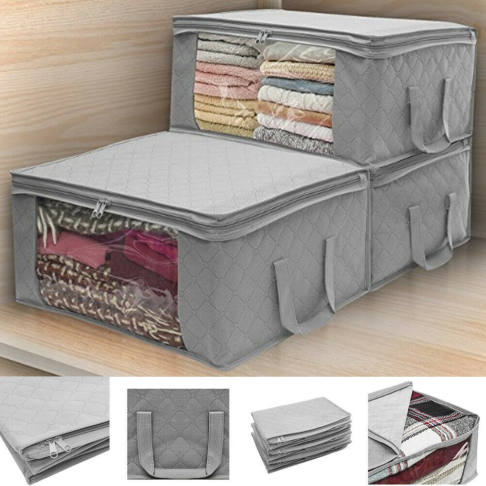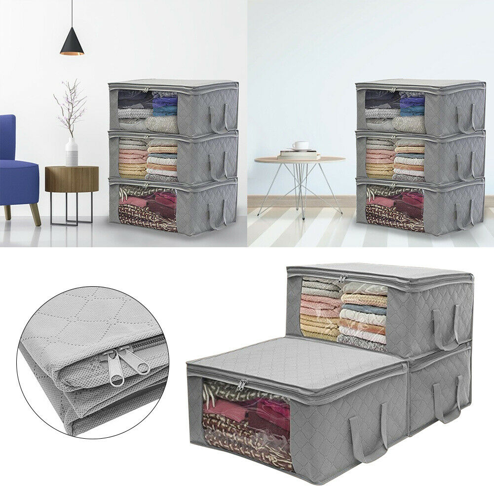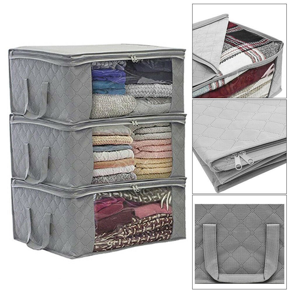 3x Grey Clothes Storage Bags Ziped Organizer Underbed Wardrobe Cube Closet Boxes