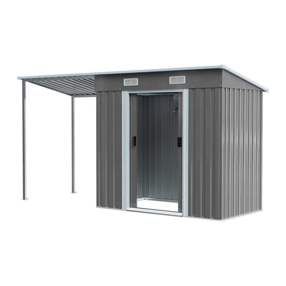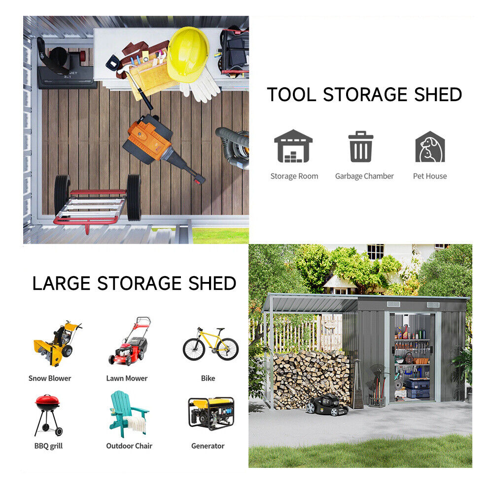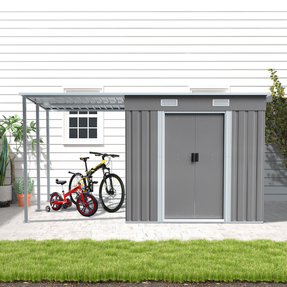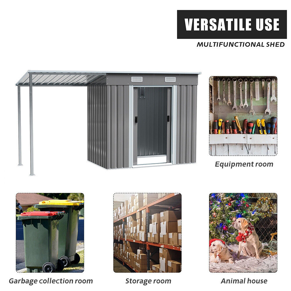 4/5/6/8/10FT Steel Garden Storage Shed Tool House with Side Canopy & 2 Air Vents