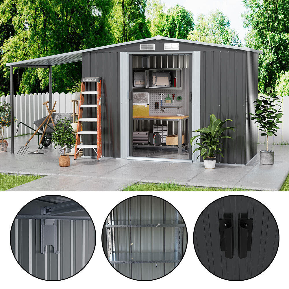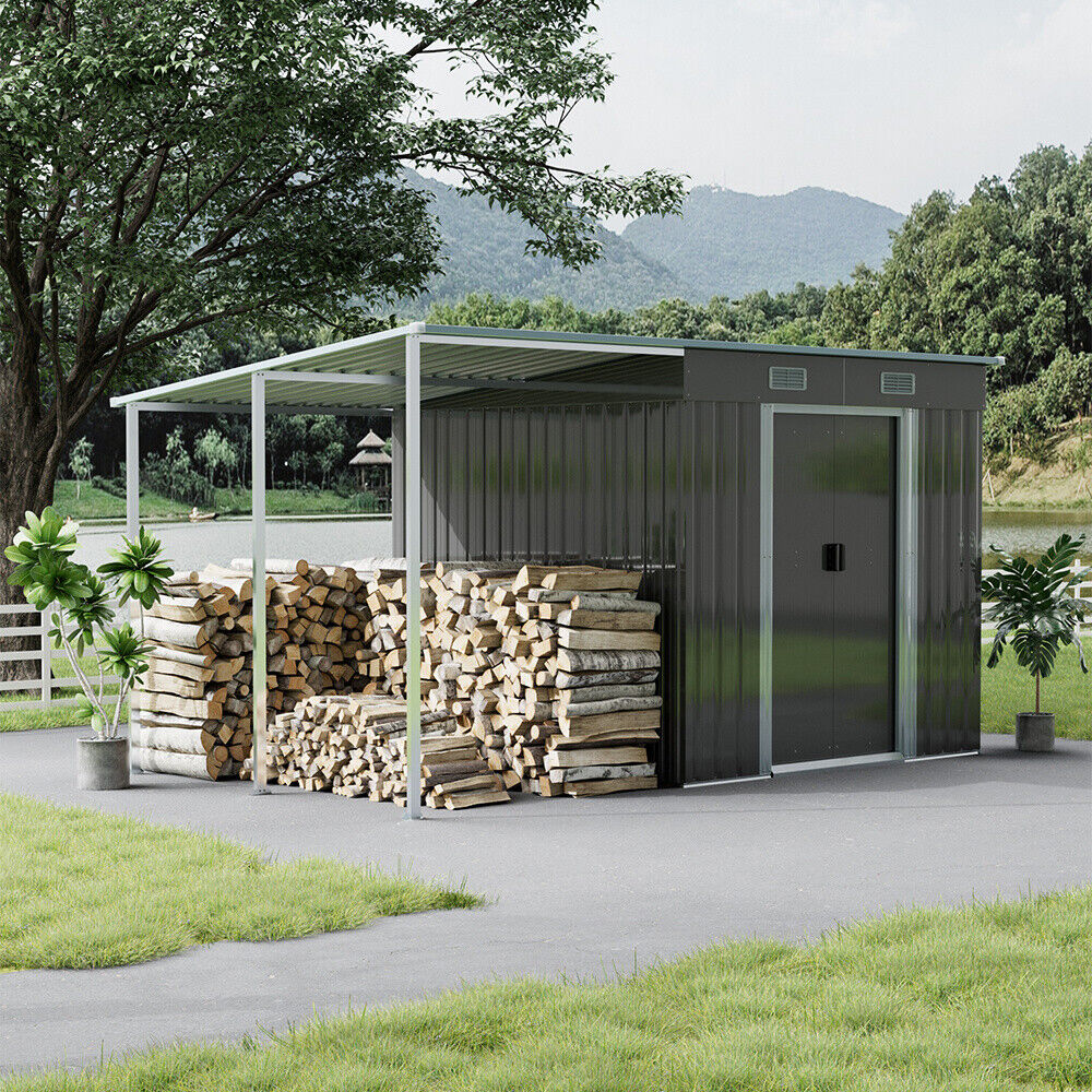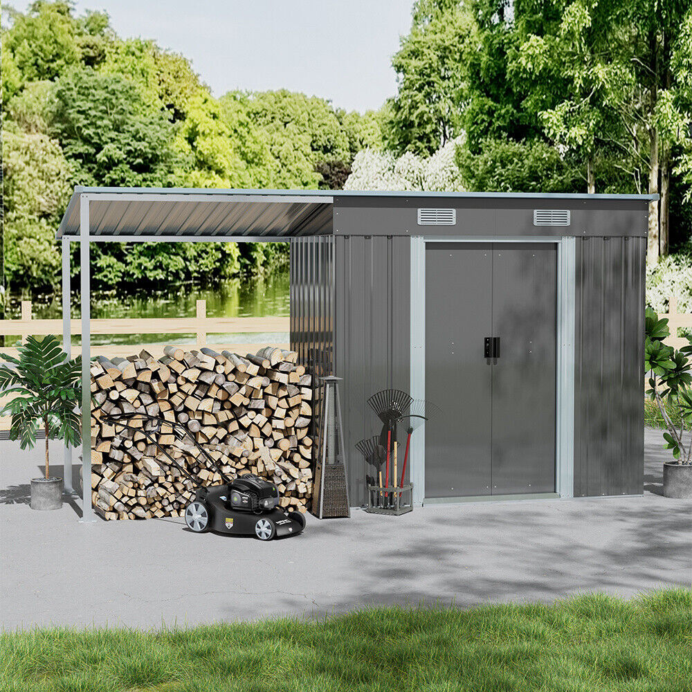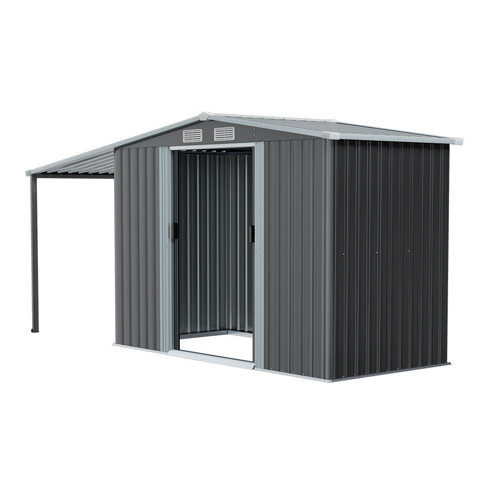 4/5/6/8/10FT Steel Garden Storage Shed Tool House with Side Canopy & 2 Air Vents