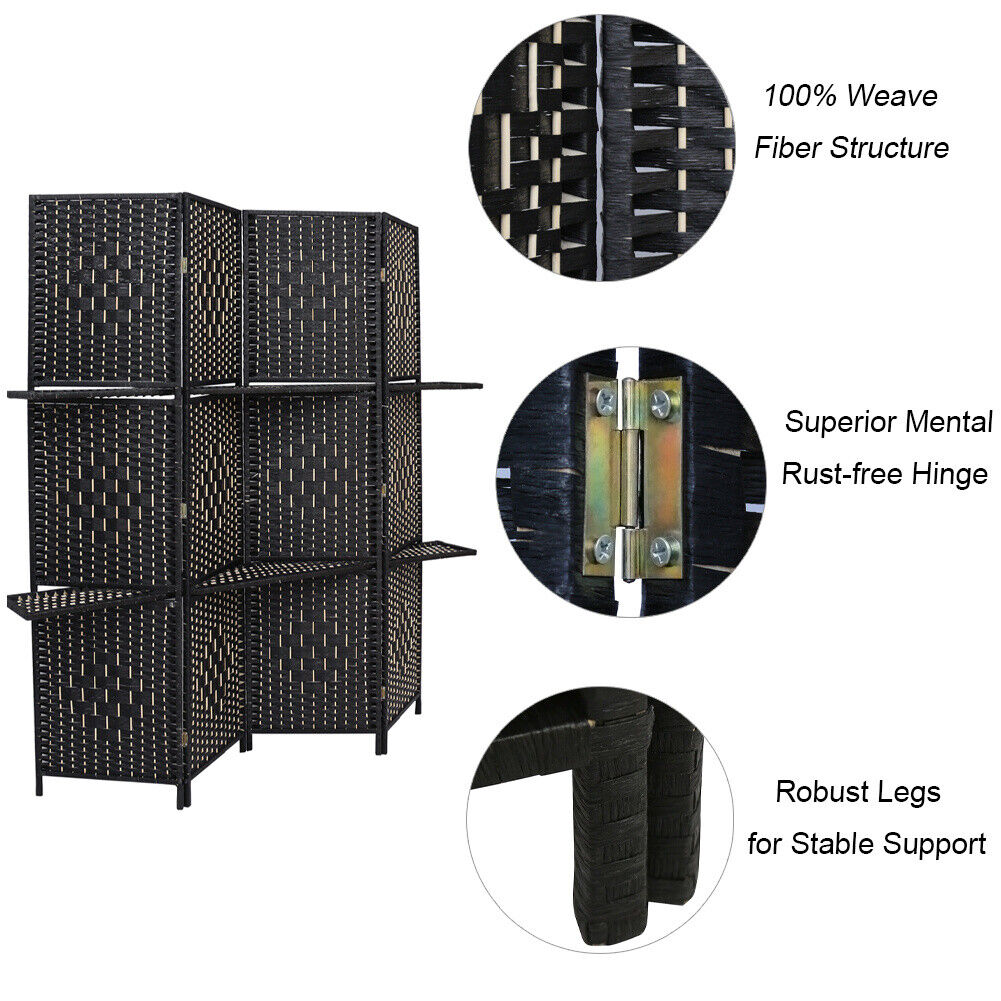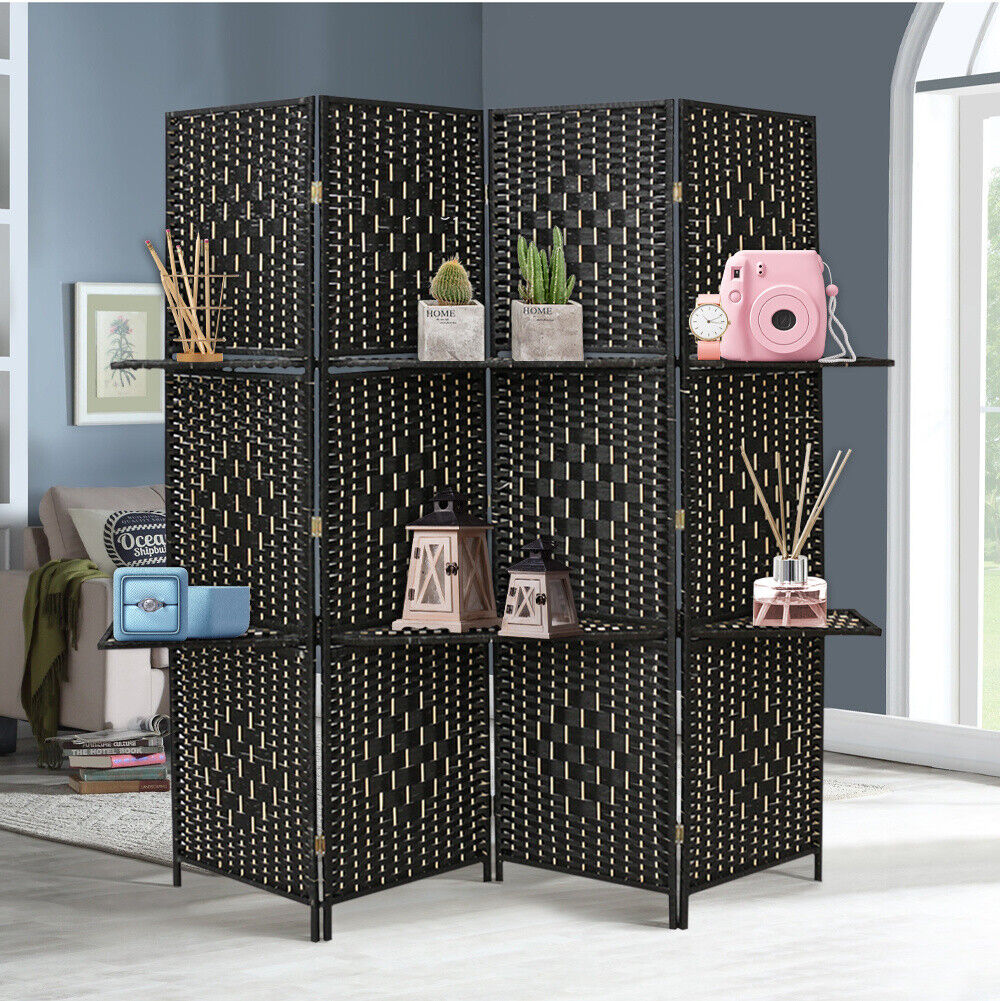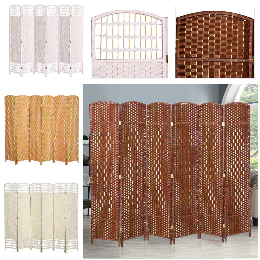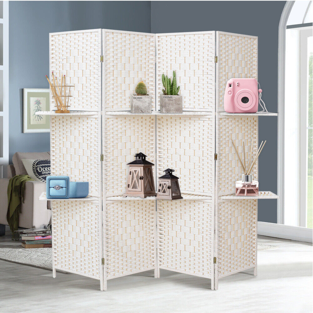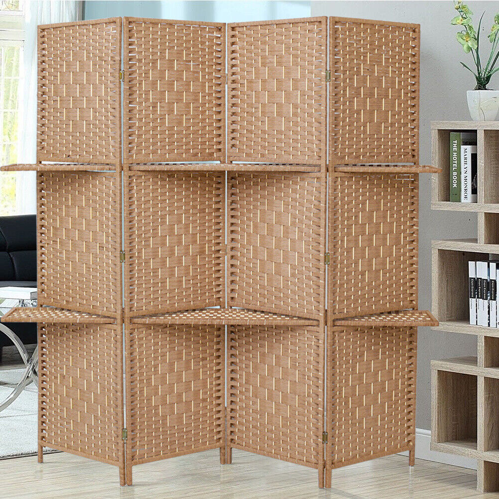 4/6 Panel Solid Weave Wicker Wood Room Divider Partition Screen Shelf Optional
