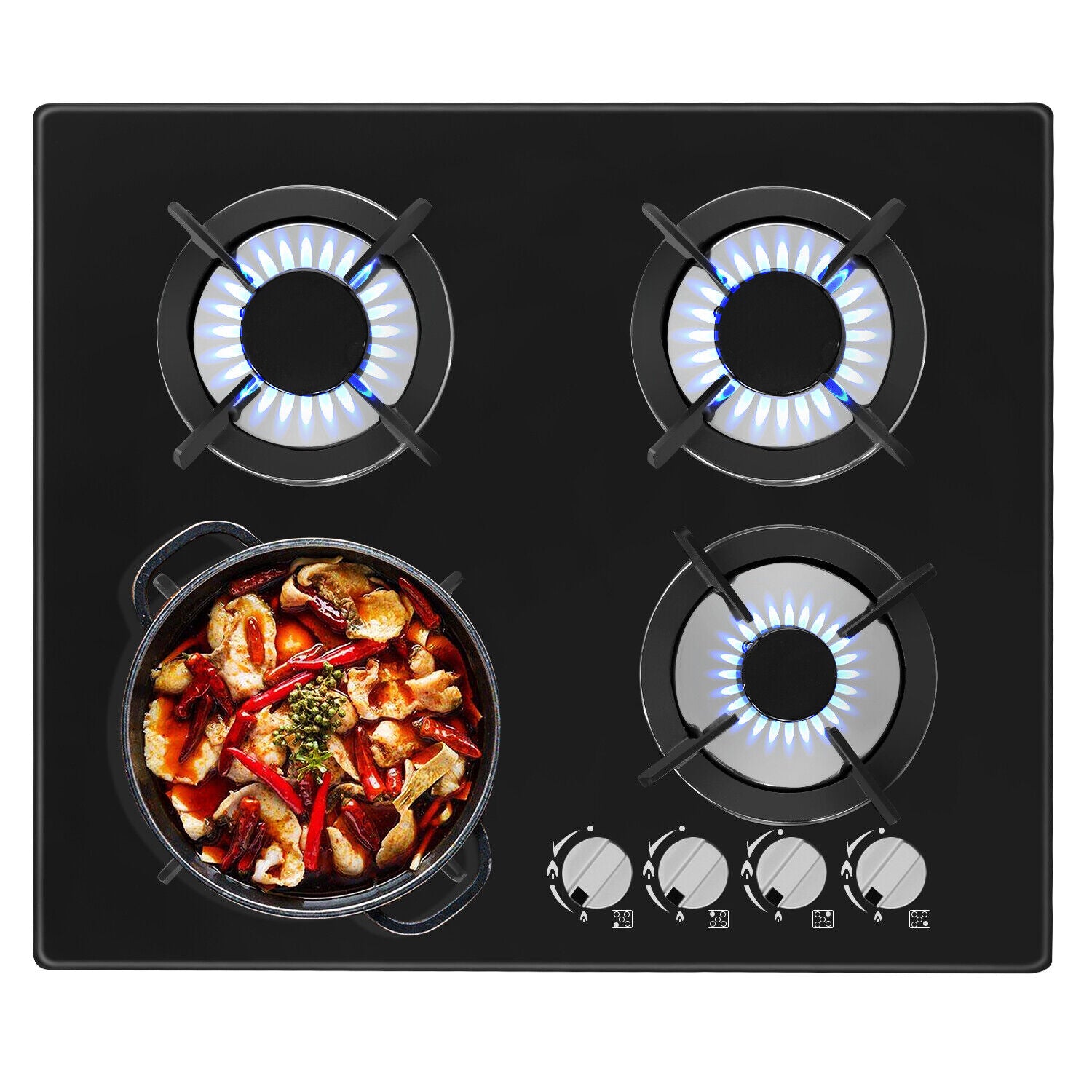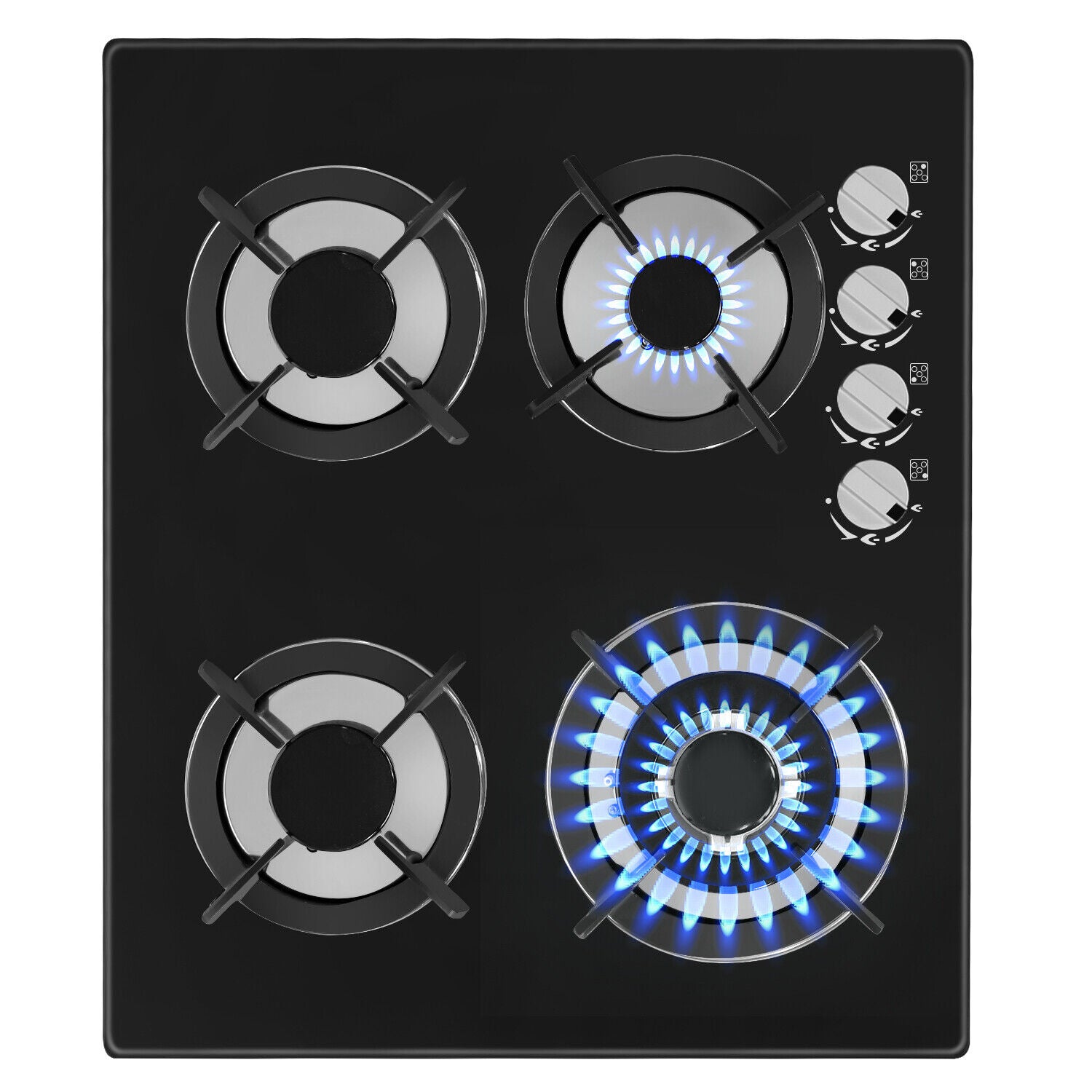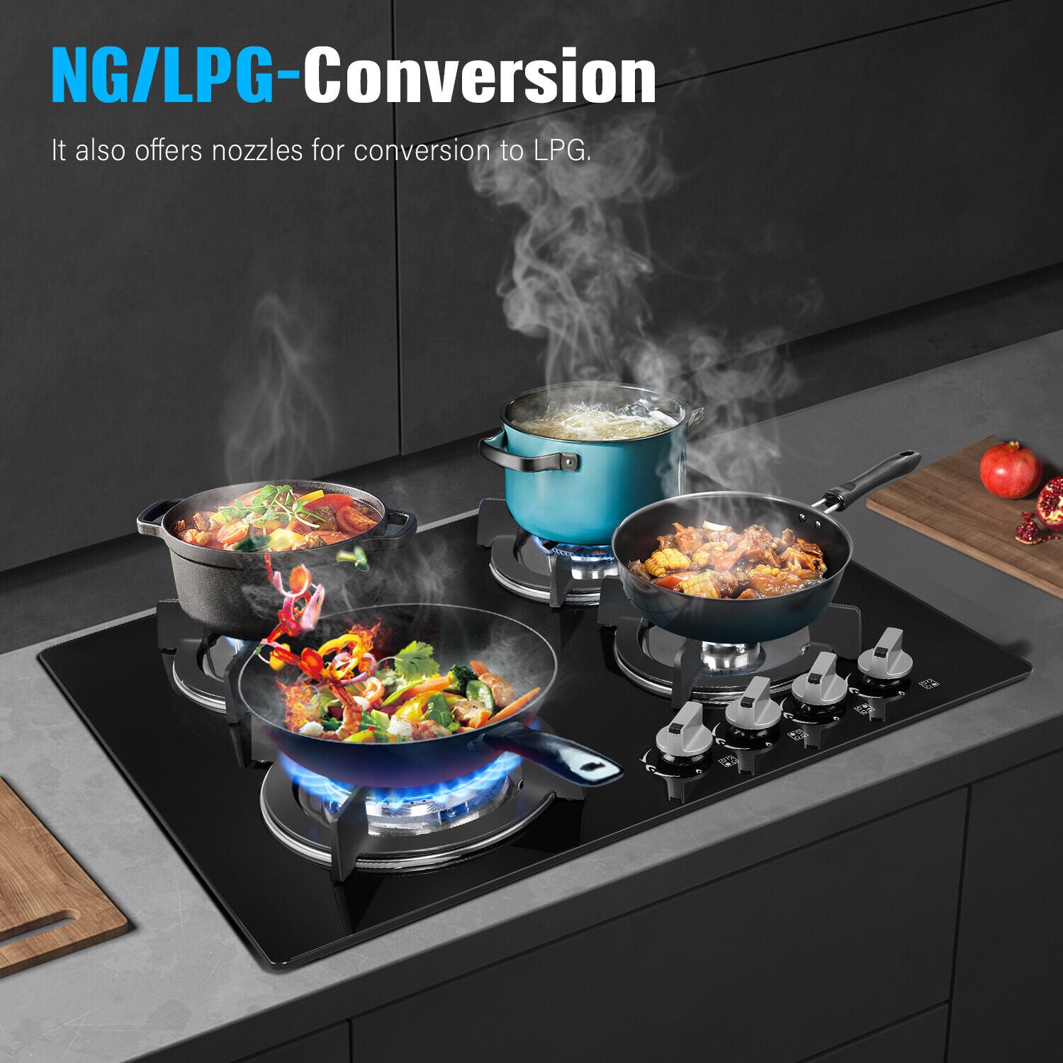 4 Burners Gas Hob 60cm Black Tempered Glass NG/LPG Convert With Iron Pan