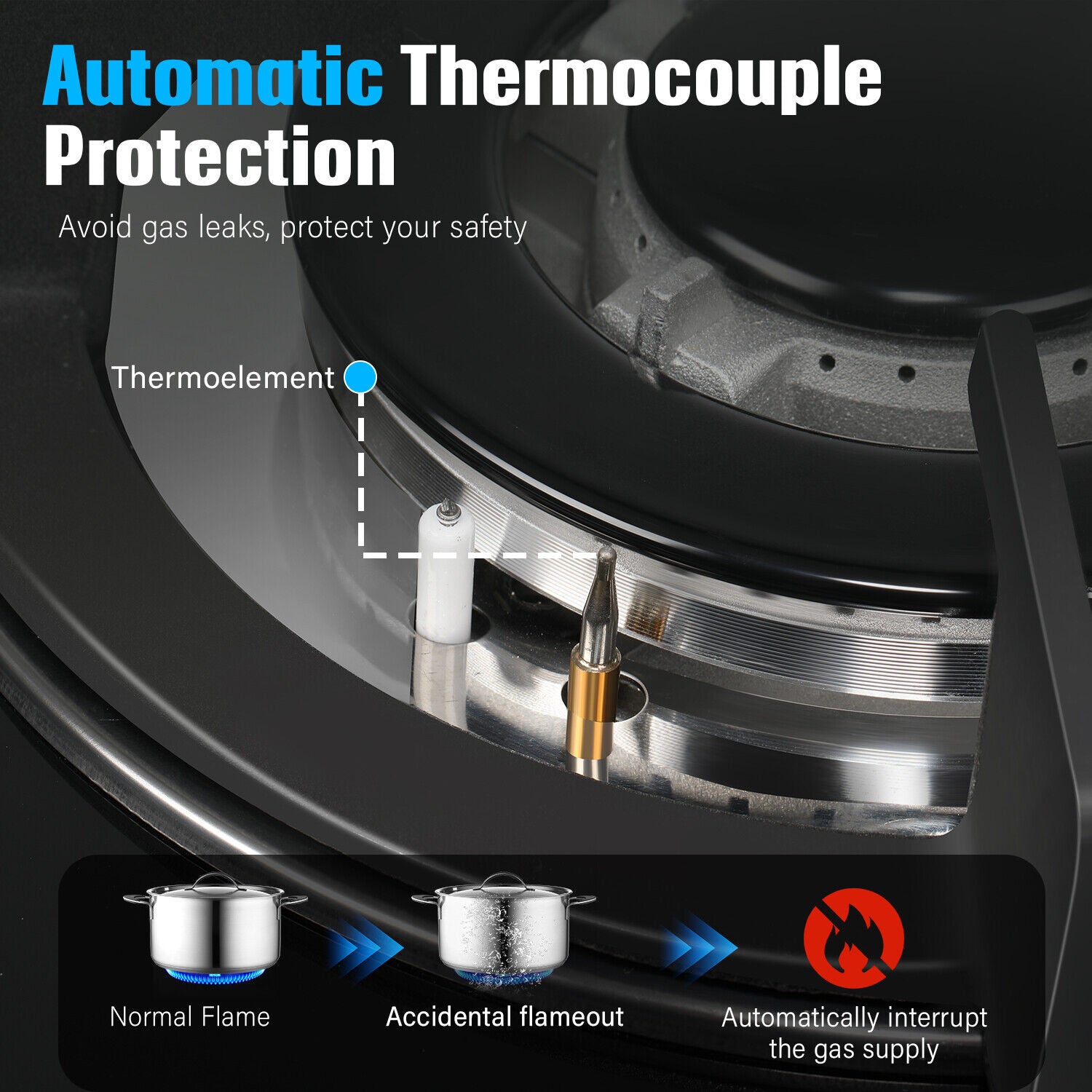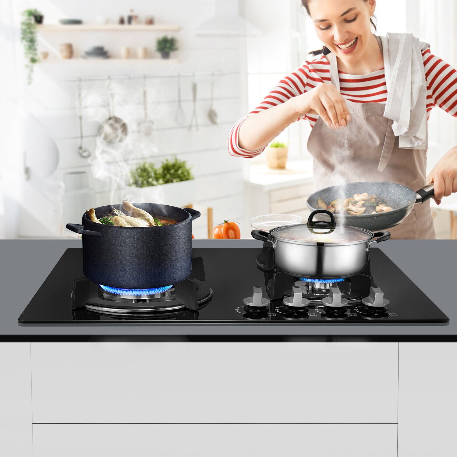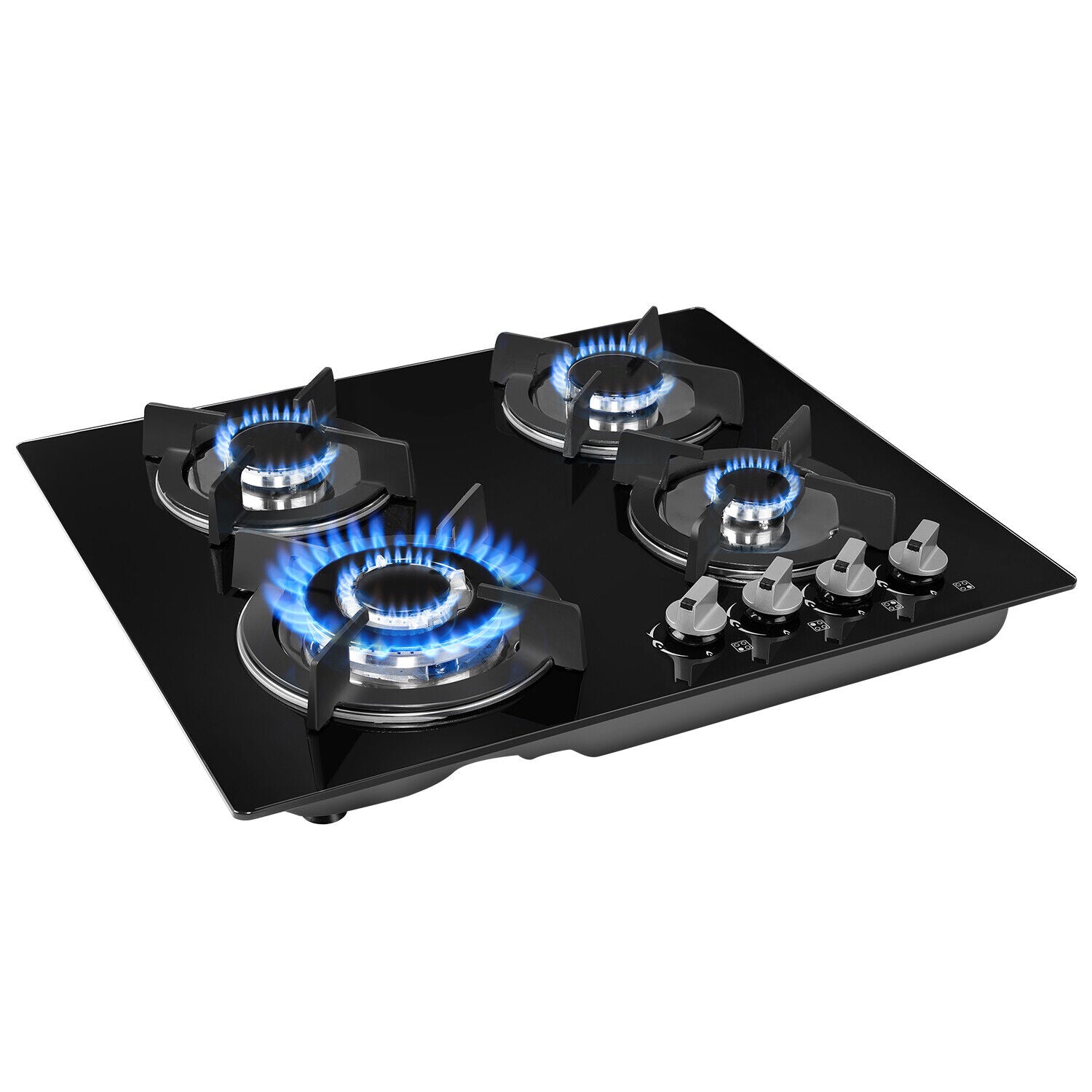 4 Burners Gas Hob 60cm Black Tempered Glass NG/LPG Convert With Iron Pan