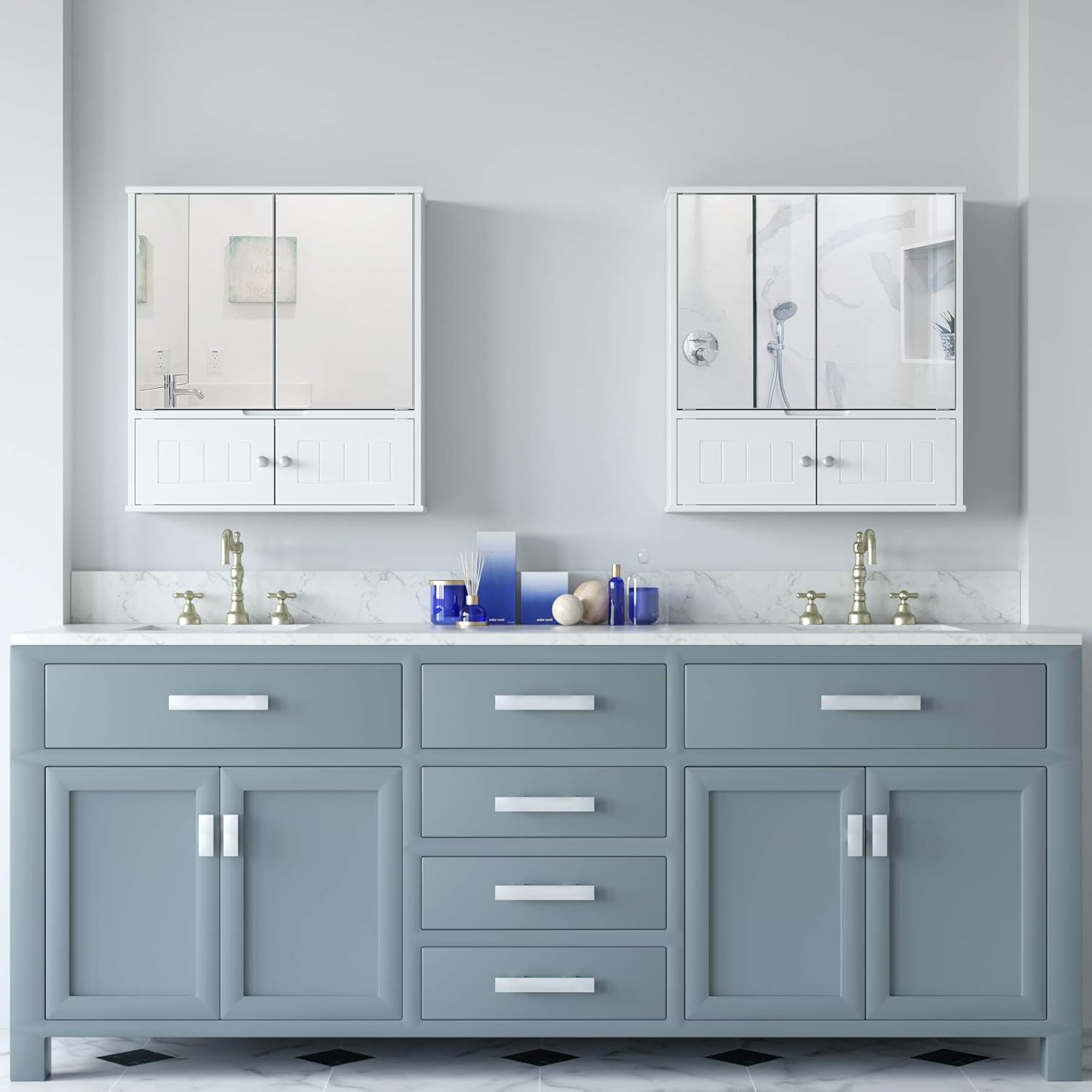 SIMPLE MODERN STYLE - The medicine cabinet with mirror is characterized by a simple silhouette and elegant decorative strips in white, which creates a chic, charming look that goes with any color palette. A large mirror can brighten and visually enlarge the bathroom space while making makeup and shaving more convenient.
