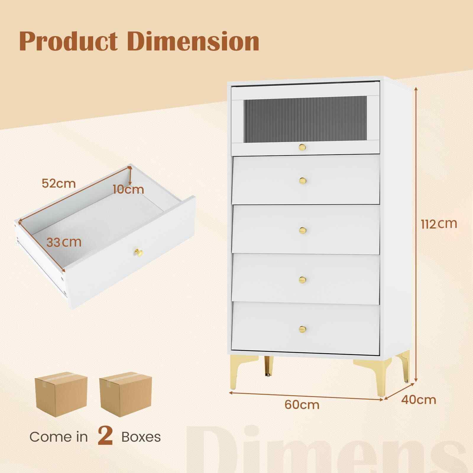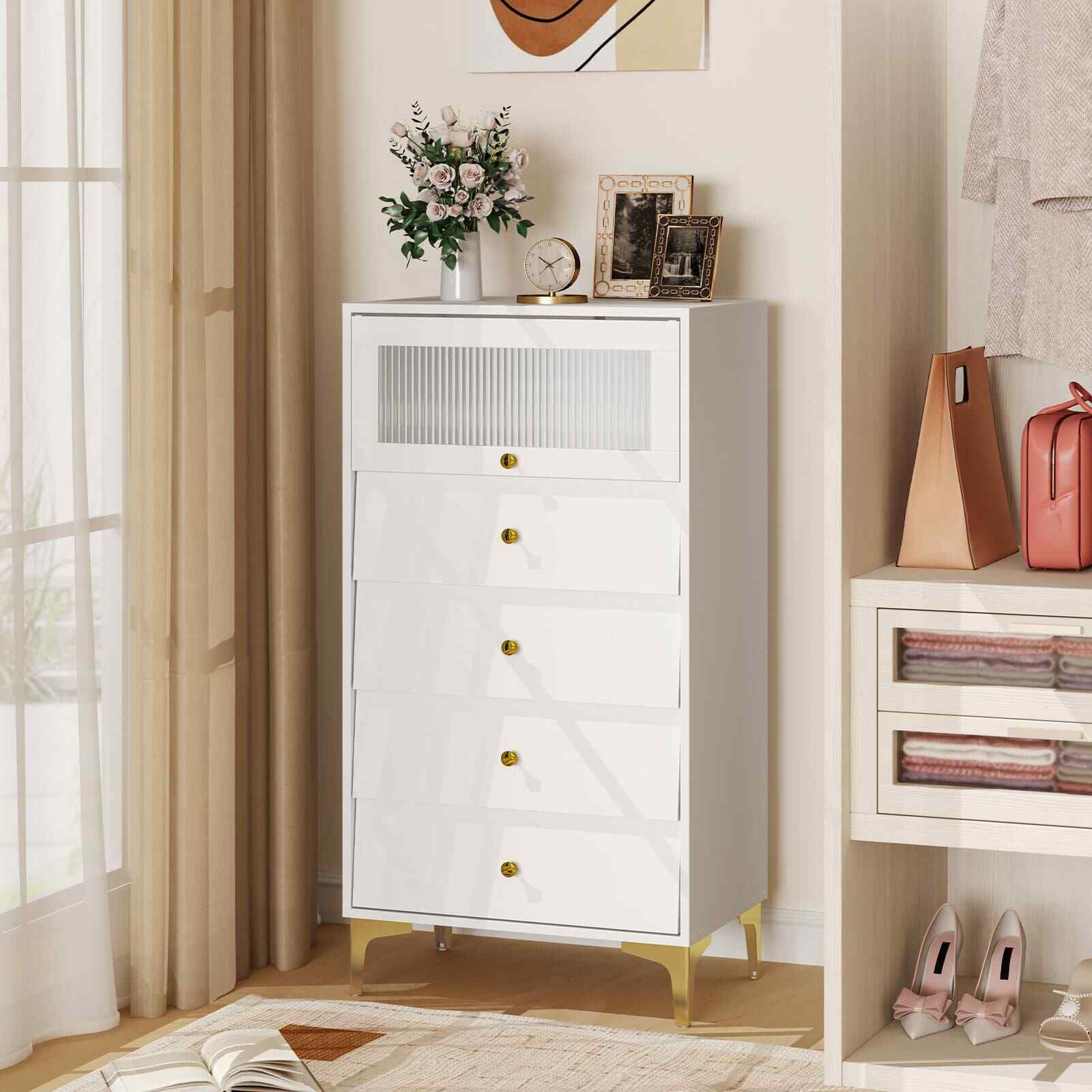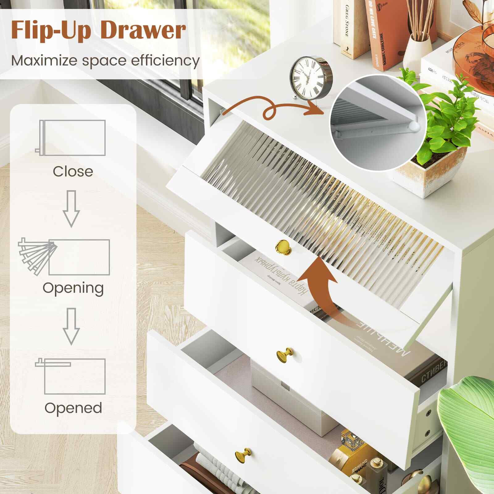 4 Drawer Dresser w/ Flip Up Fluted Glass Door & Pull-out Drawers