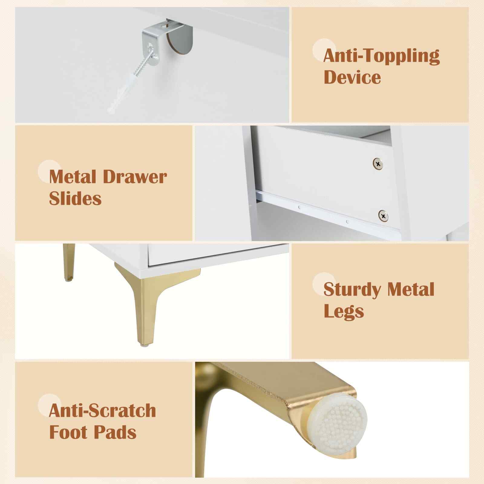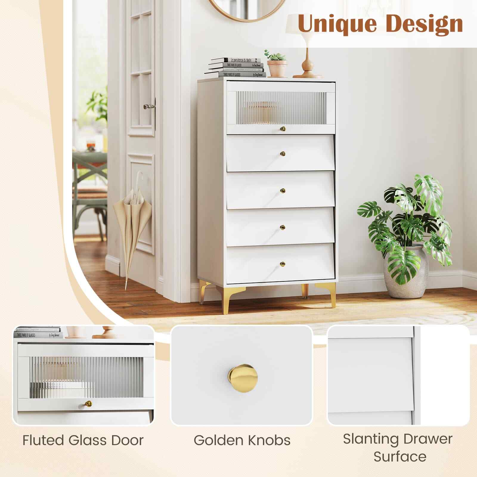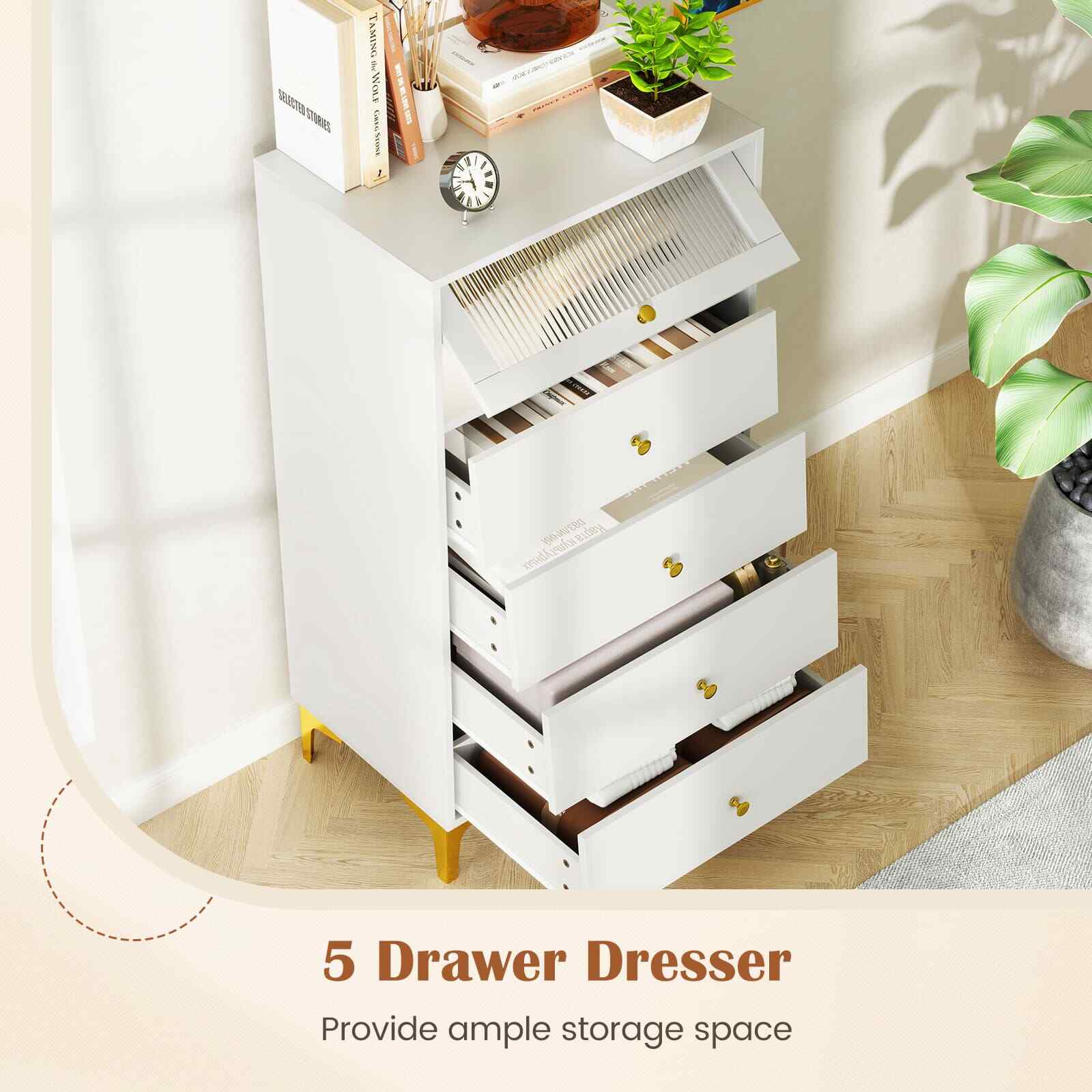 4 Drawer Dresser w/ Flip Up Fluted Glass Door & Pull-out Drawers