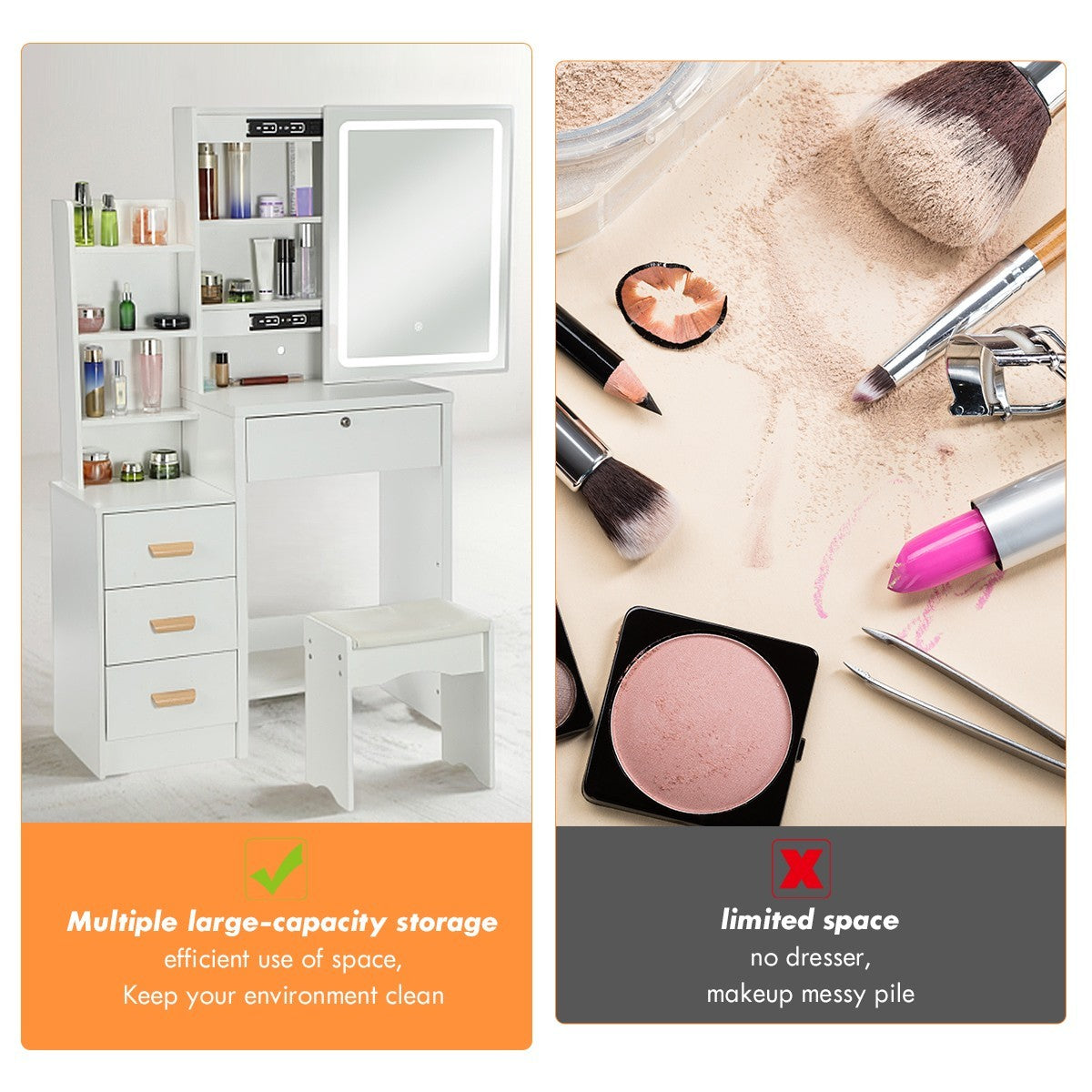 Features With LED, With Bulbs, Flat Pack, With Cupboard, With Drawers, With Mirror, With Stool