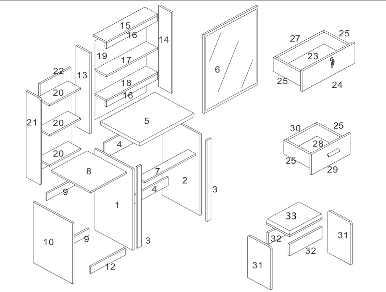 With LED, With Bulbs, Flat Pack, With Cupboard, With Drawers, With Mirror, With Stool
