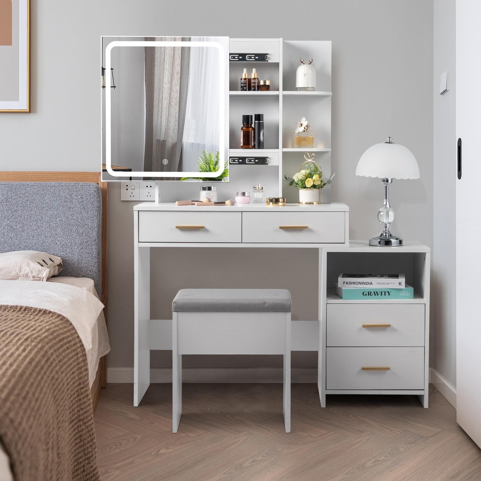 4 Drawers White Dressing Table Set Makeup Desk with Mirror Stool Shelf Storage