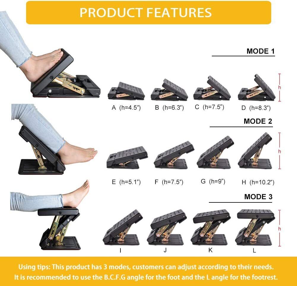 4-Height Adjustable UnderDesk Footrest Stool Angle Tilt Anti-Slip Compact Health