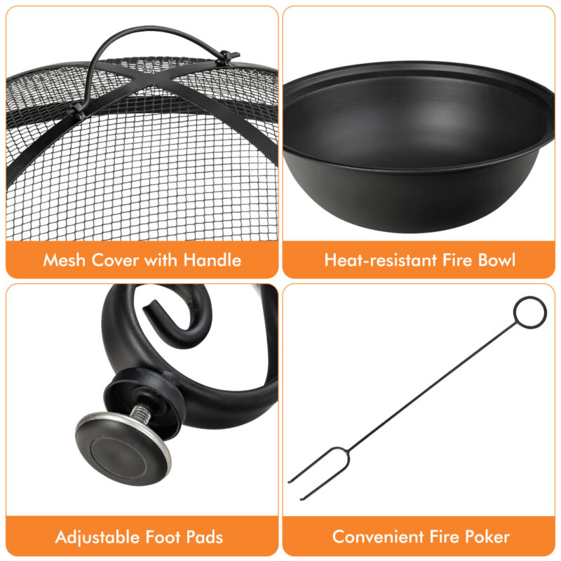 4 in 1 Outdoor Fire Pit Dining Table Round Wood Burning Fire Bowl W/ Mesh Cover