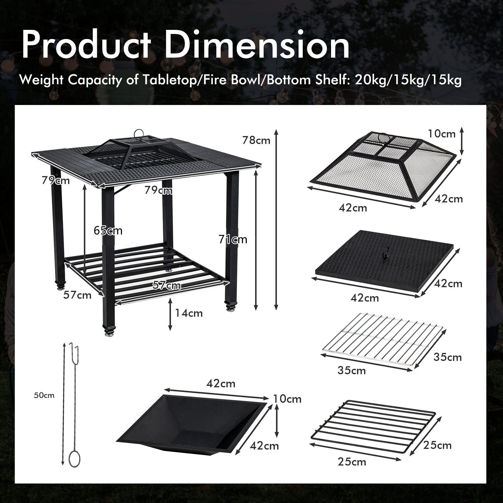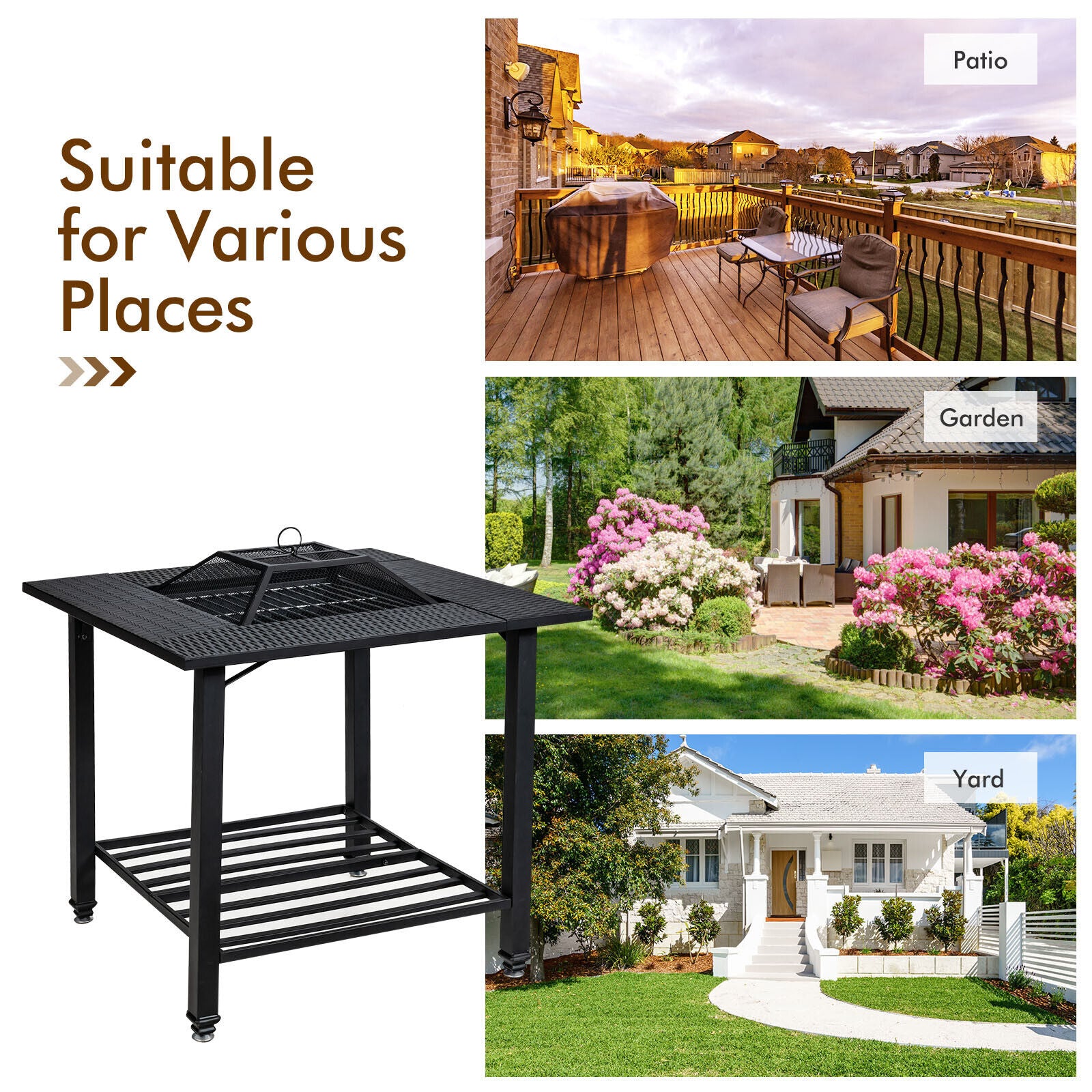 4 in 1 Outdoor Fire Pit Dining Table Square Wood Burning Fire Bowl W/ Mesh Cover