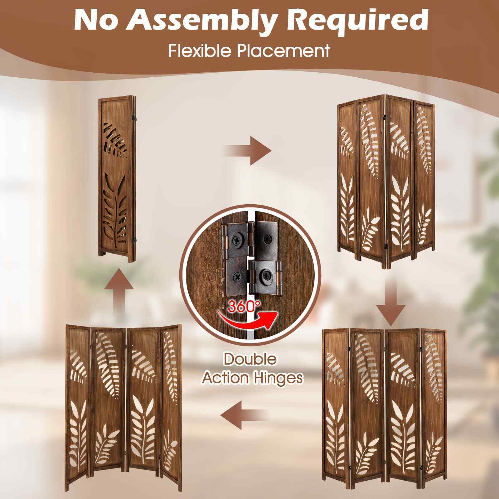 4-Panel Room Divider Privacy Screen with Carved Leaf Pattern-Brown