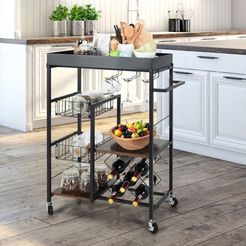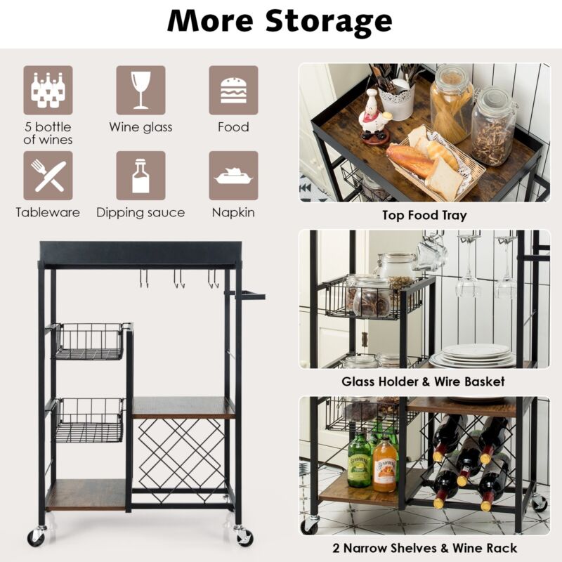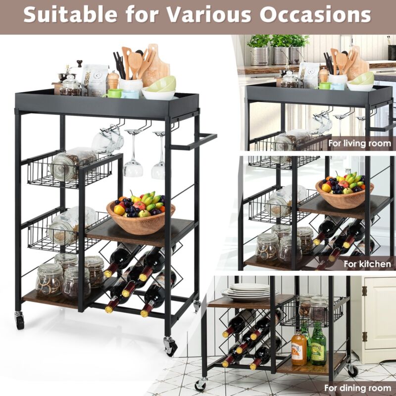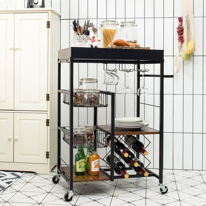 4-Tier Kitchen Serving Trolley Rolling Storage Cart W/ Wine Rack & Glass Holder