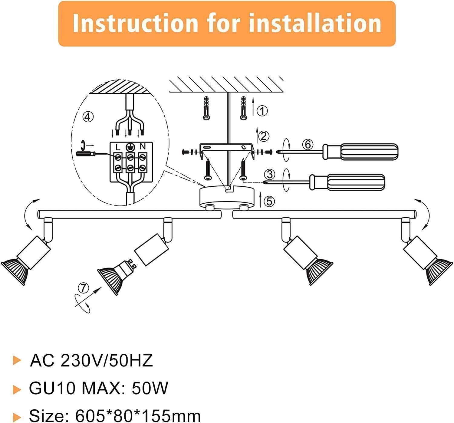 4 Way Ceiling Spotlight Adjustable Kitchen Bar Spot Light LED GU10 Bulbs Lamp