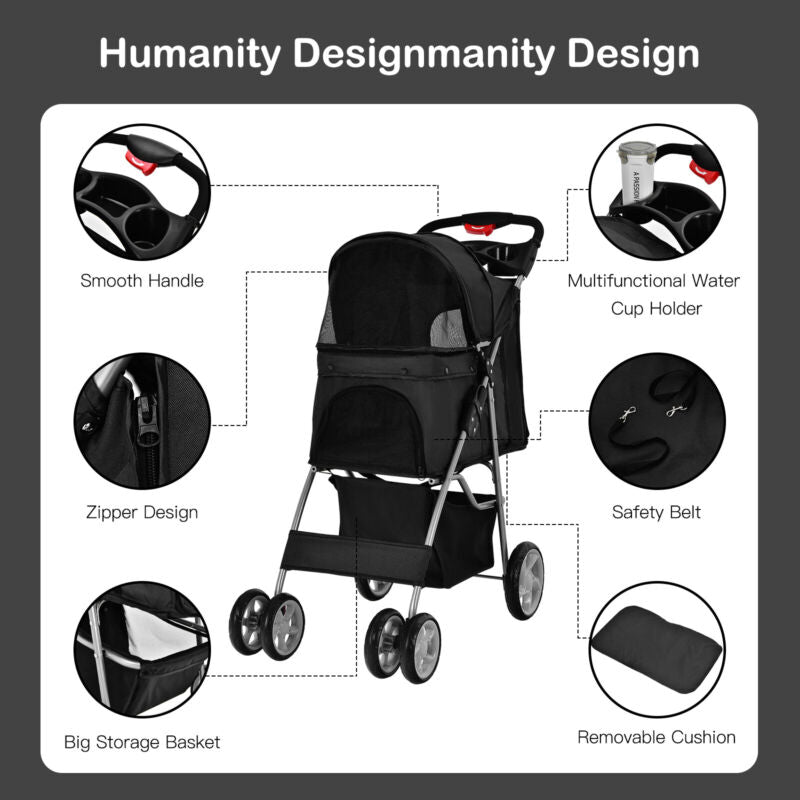 4-Wheel Pet Stroller Dog Cat Walk Travel Carrier Carriage with Storage Basket