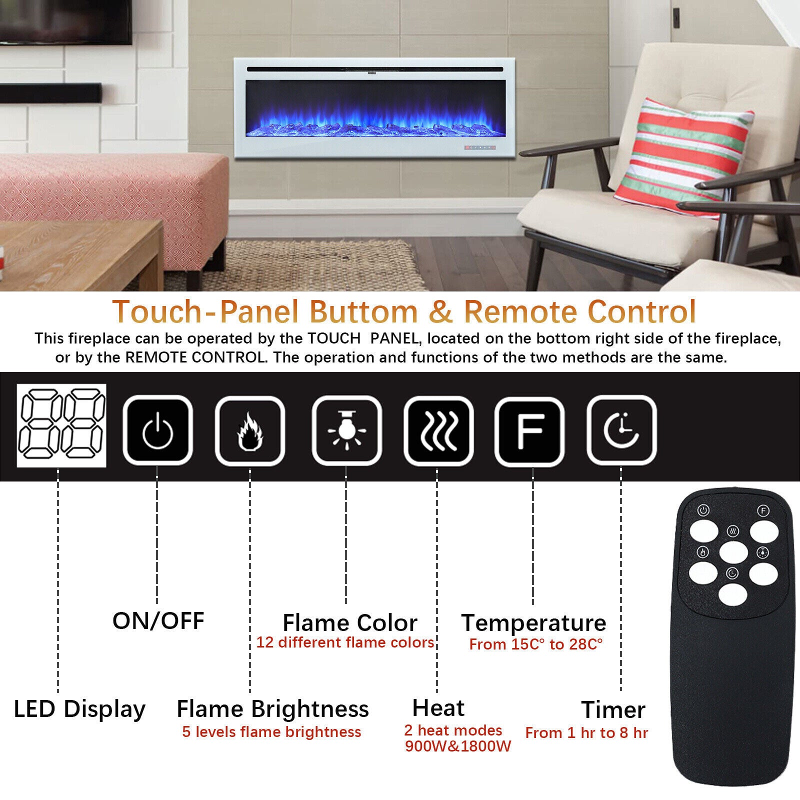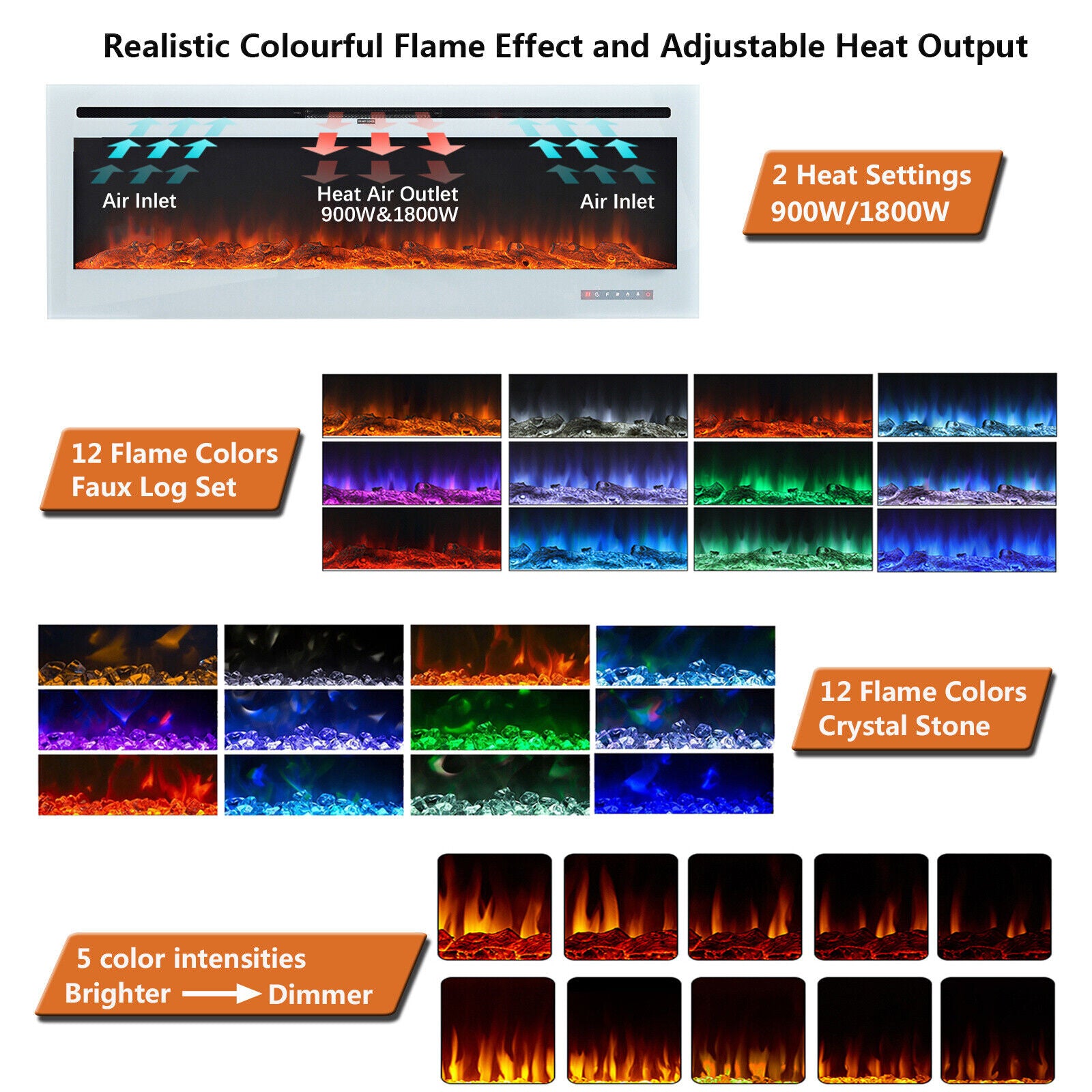 Adjustable Brightness, Adjustable Flame Colors, Adjustable Thermostat, LED Flames, On/Off Switch, Remote Control, Timer, Wall-Mountable, LCD Display, With Natural Pebbles, With Wall Bracket, Crystal and Log Effect Fire Included