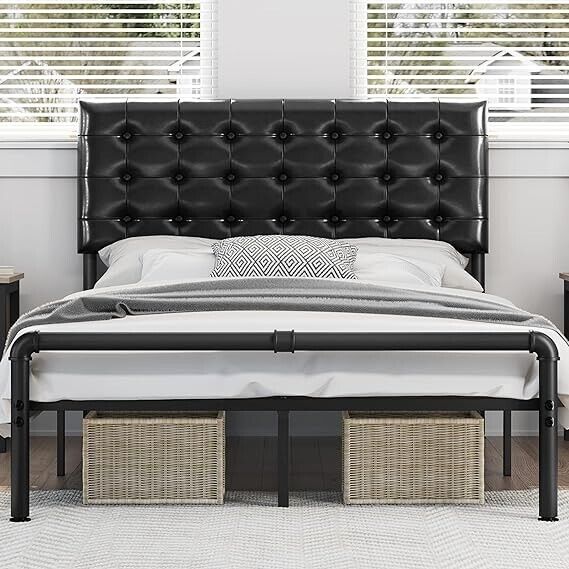 4FT6 Double Bed Frame Metal Platform Bed with Faux Leather Adjustable Headboard