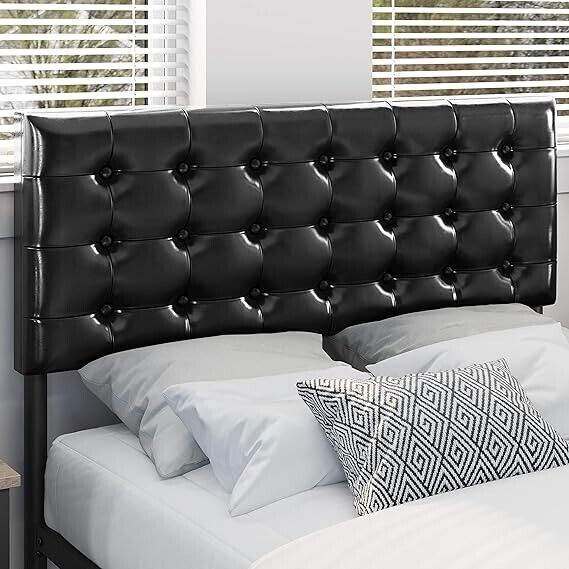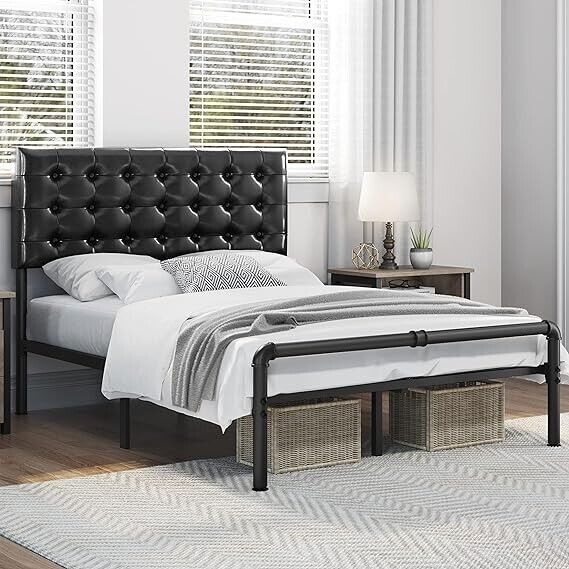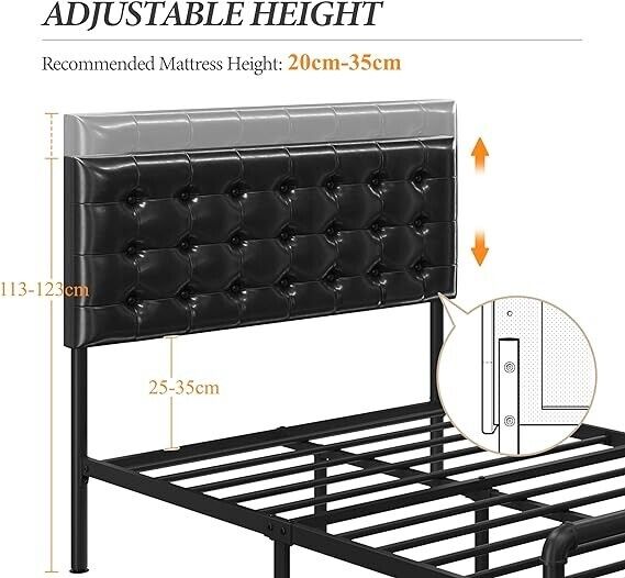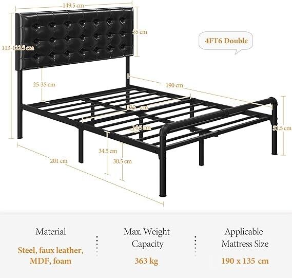 4FT6 Double Bed Frame Metal Platform Bed with Faux Leather Adjustable Headboard