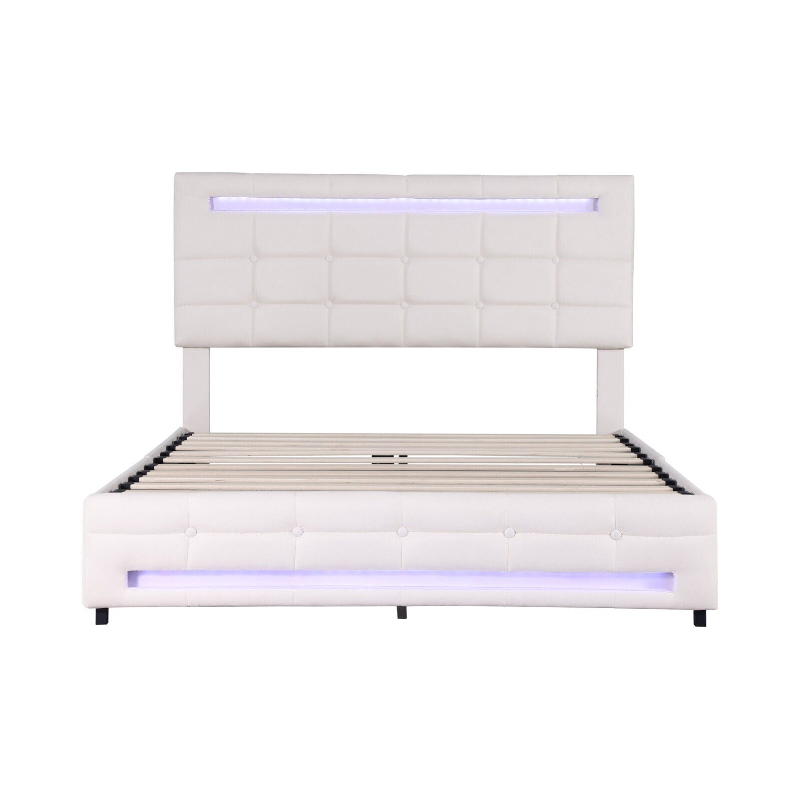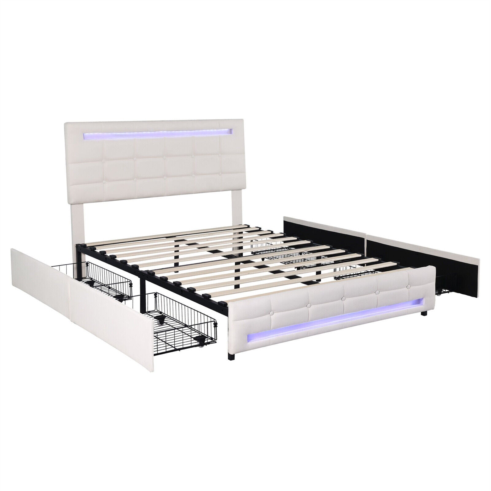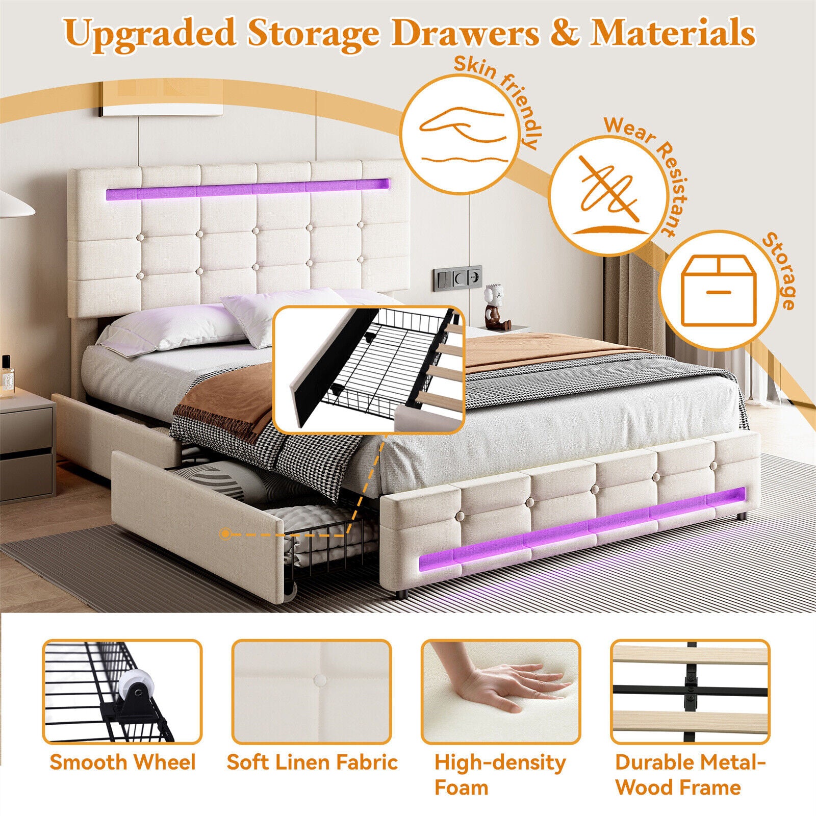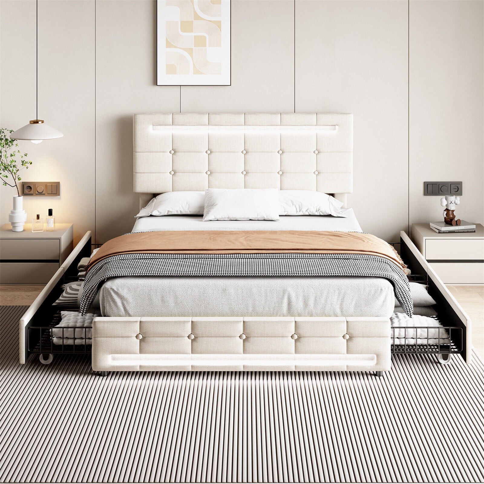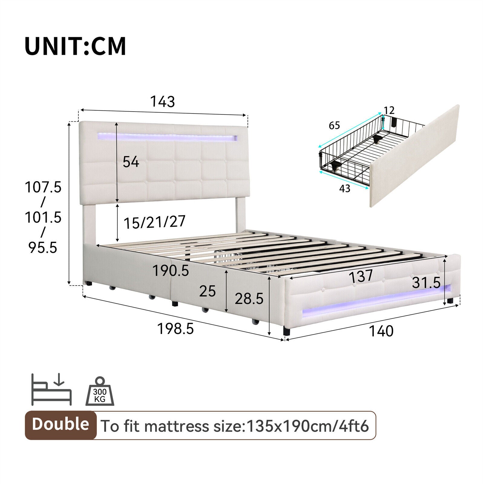 4ft6 Double Bed Frame Upholstered Platform Bed with 4 Storage Drawers, Headboard