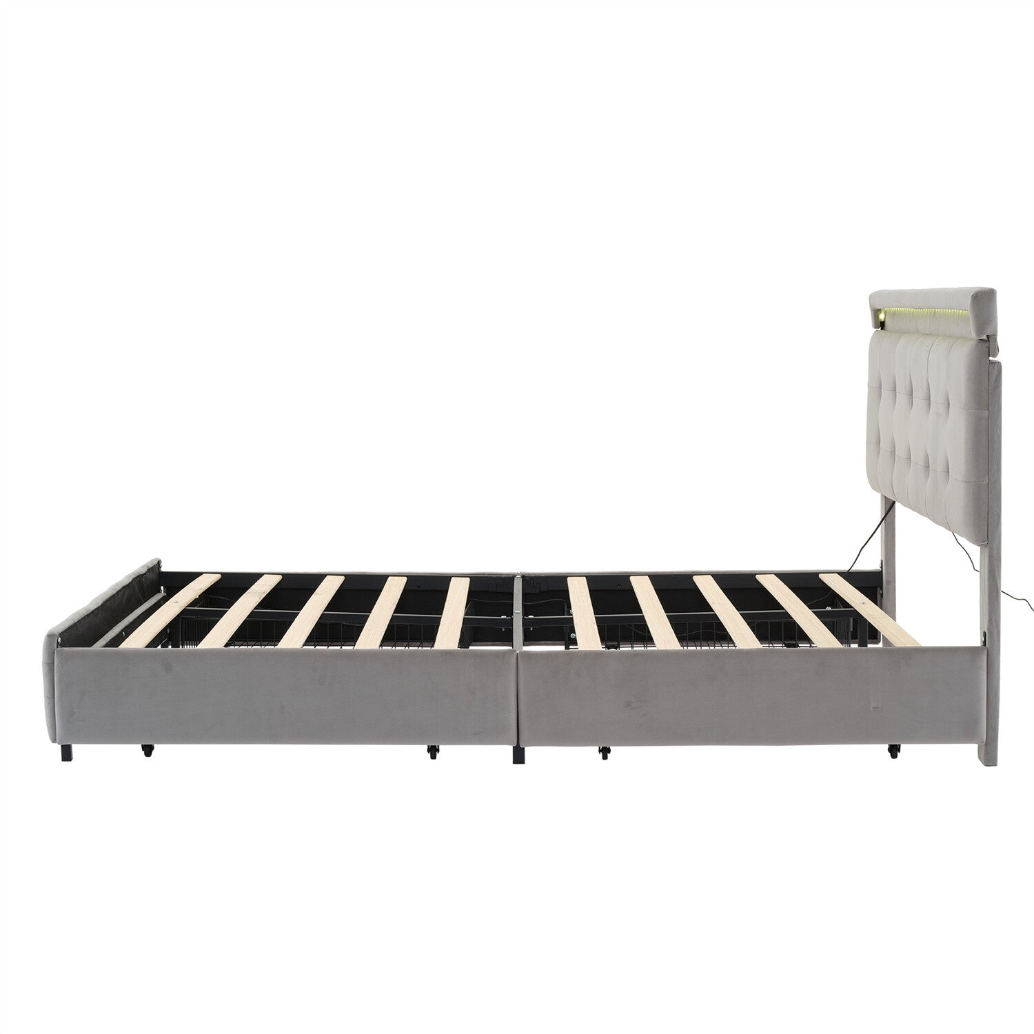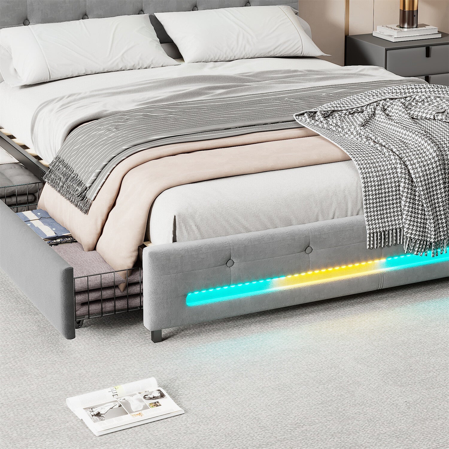 4ft6 Double Bed Frame with 4 Storage Drawers, Upholstered Headboard, LED Lights