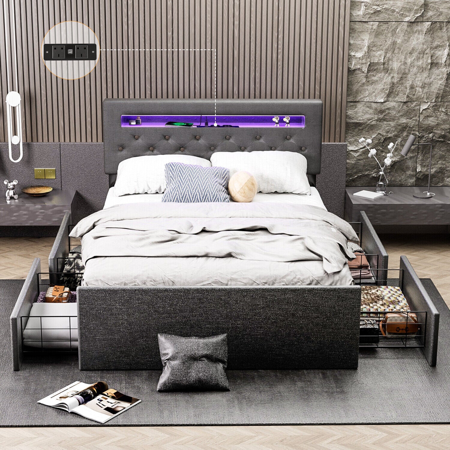 4ft6 Double Bed Frame with 4 Storage Drawers Upholstered Headboard With LED UK