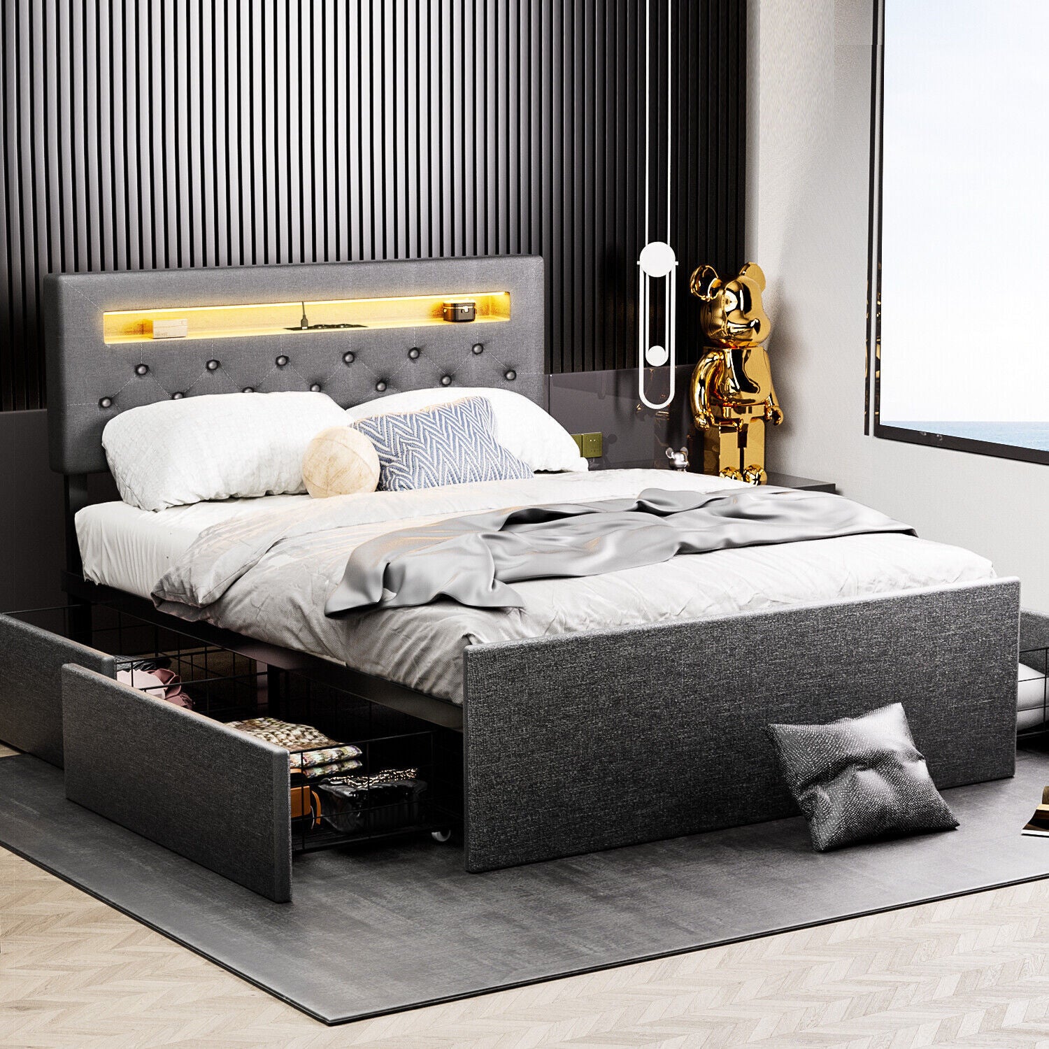 4ft6 Double Bed Frame with 4 Storage Drawers Upholstered Headboard With LED UK