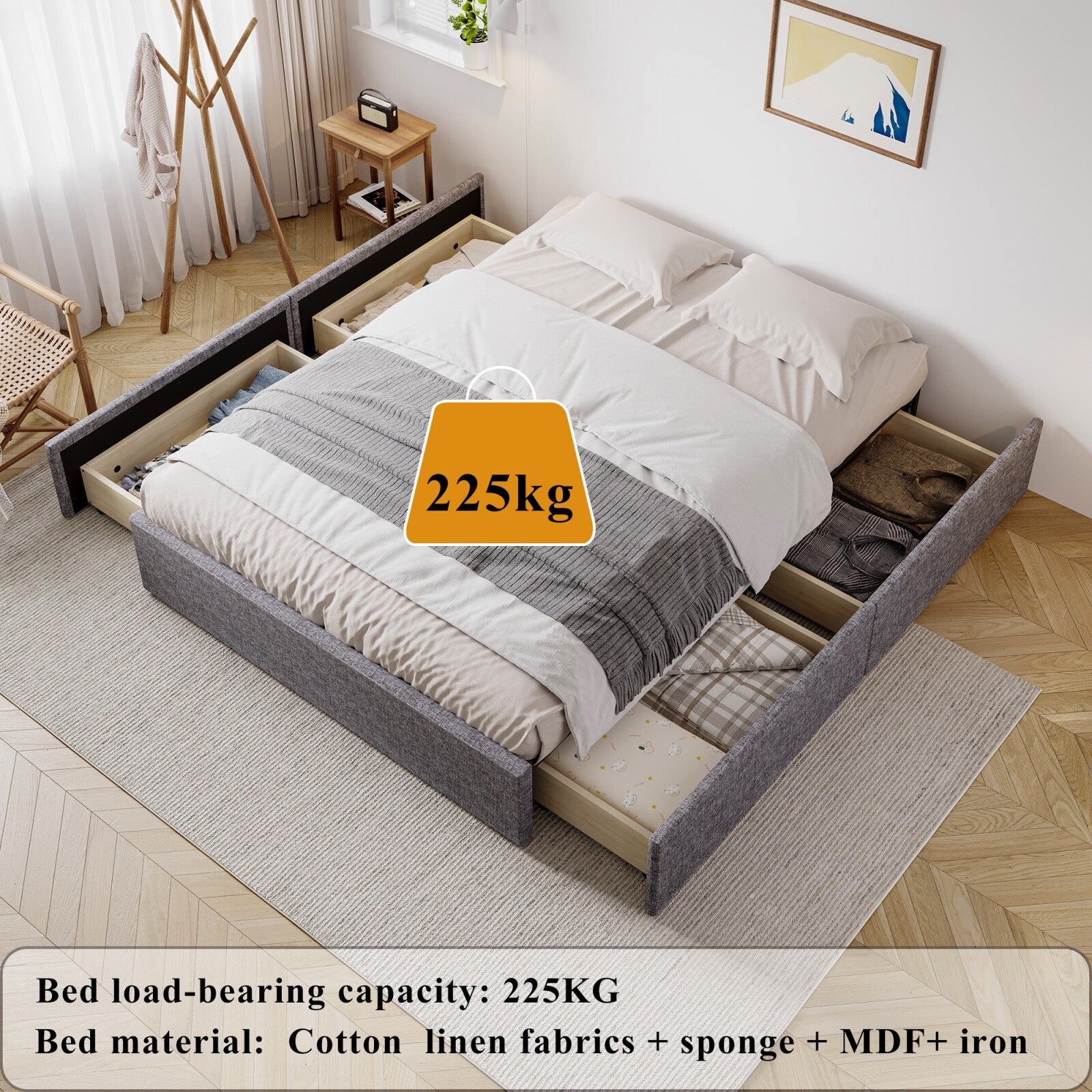 4ft6 Double Bed Linen Fabric Upholstered Bed Frame with 4 Storage Drawers Grey