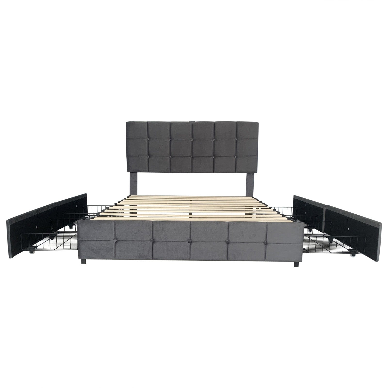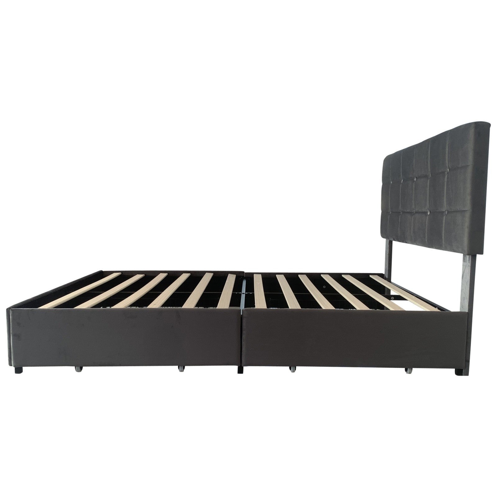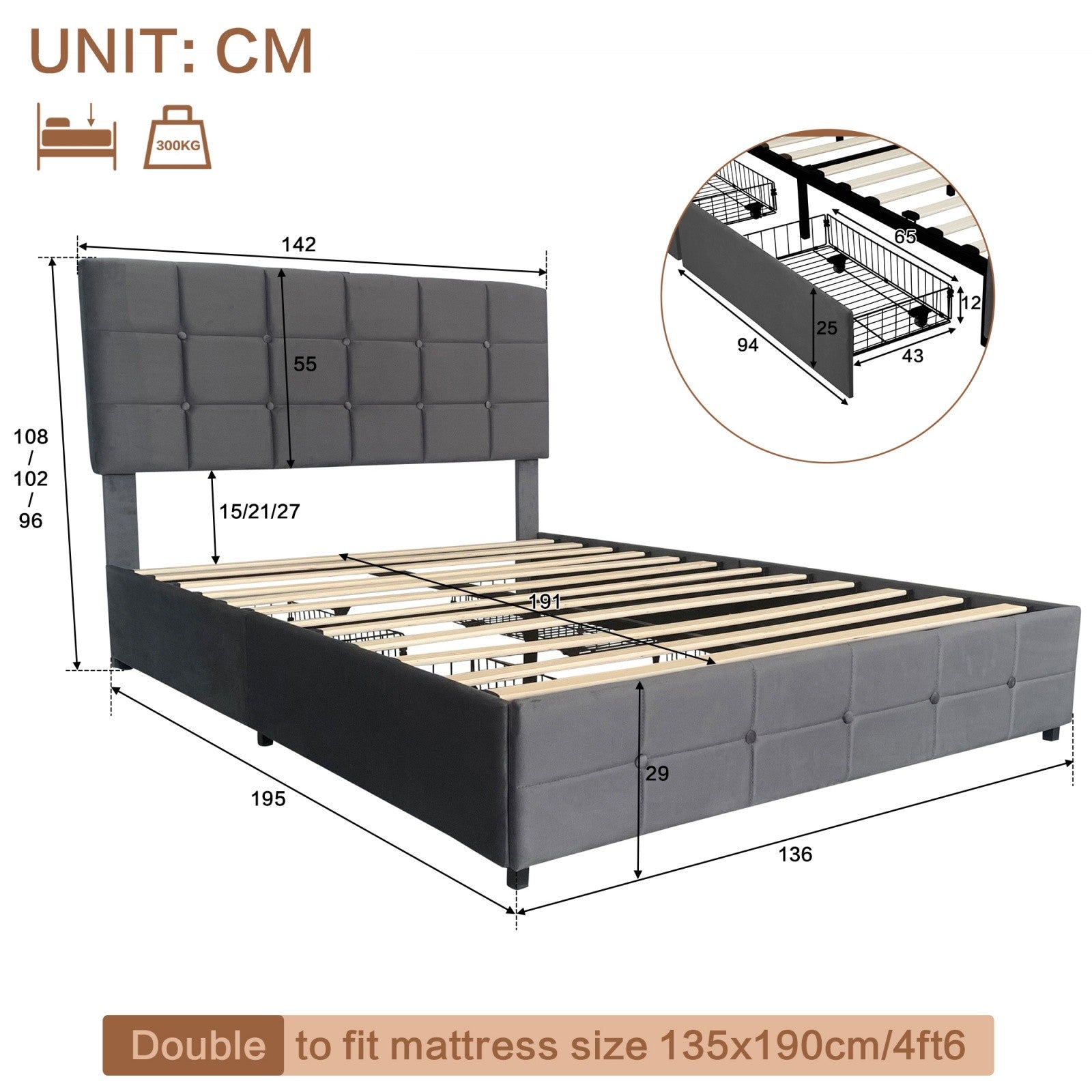 4ft6 Double Bed Upholstered Bed with 4 Storage Drawers, Tufted Headboard Grey