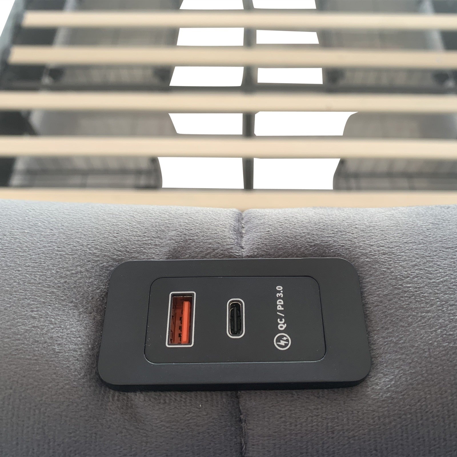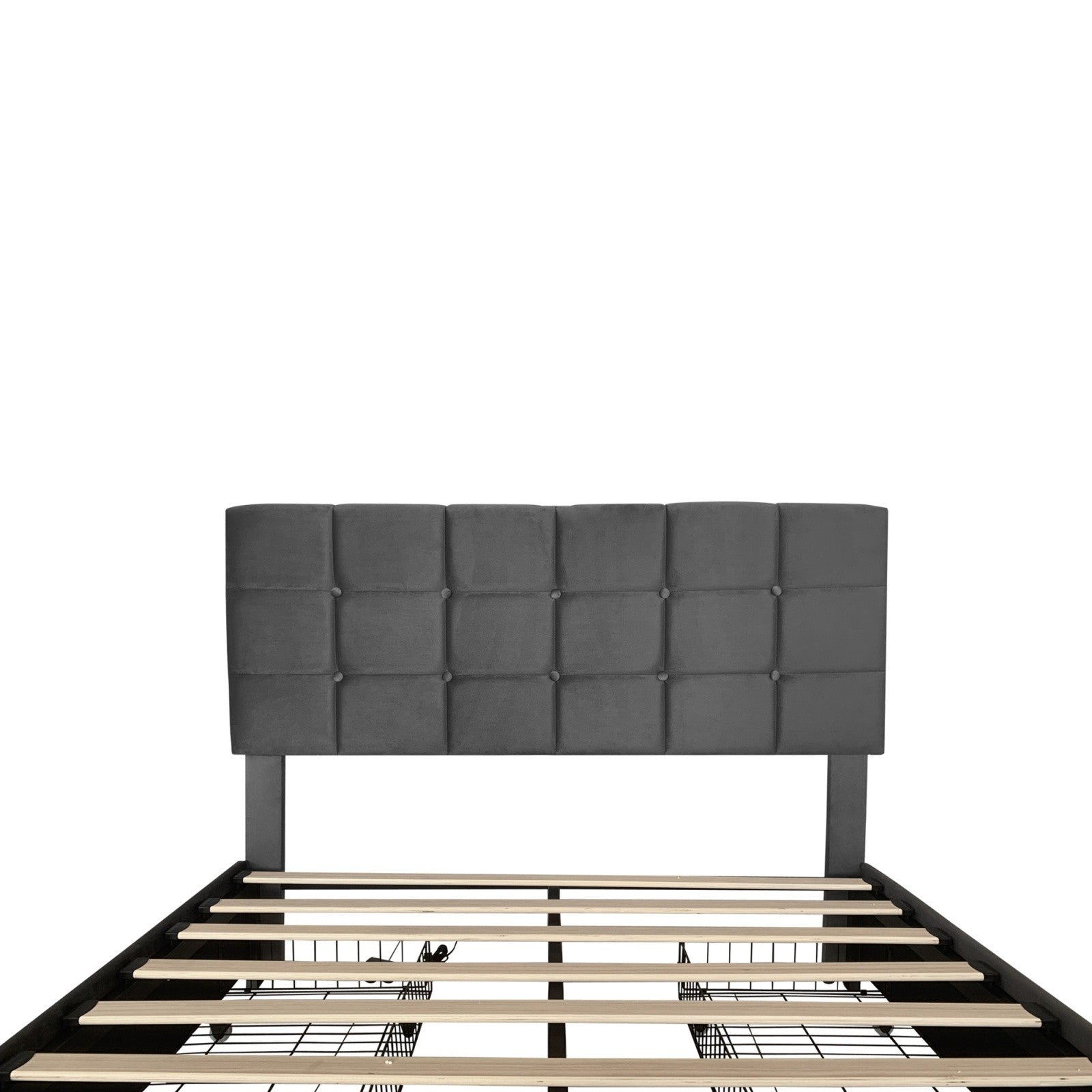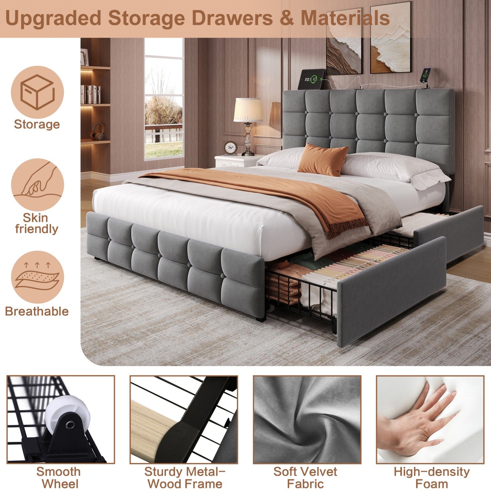 4ft6 Double Bed Upholstered Bed with 4 Storage Drawers, Tufted Headboard Grey