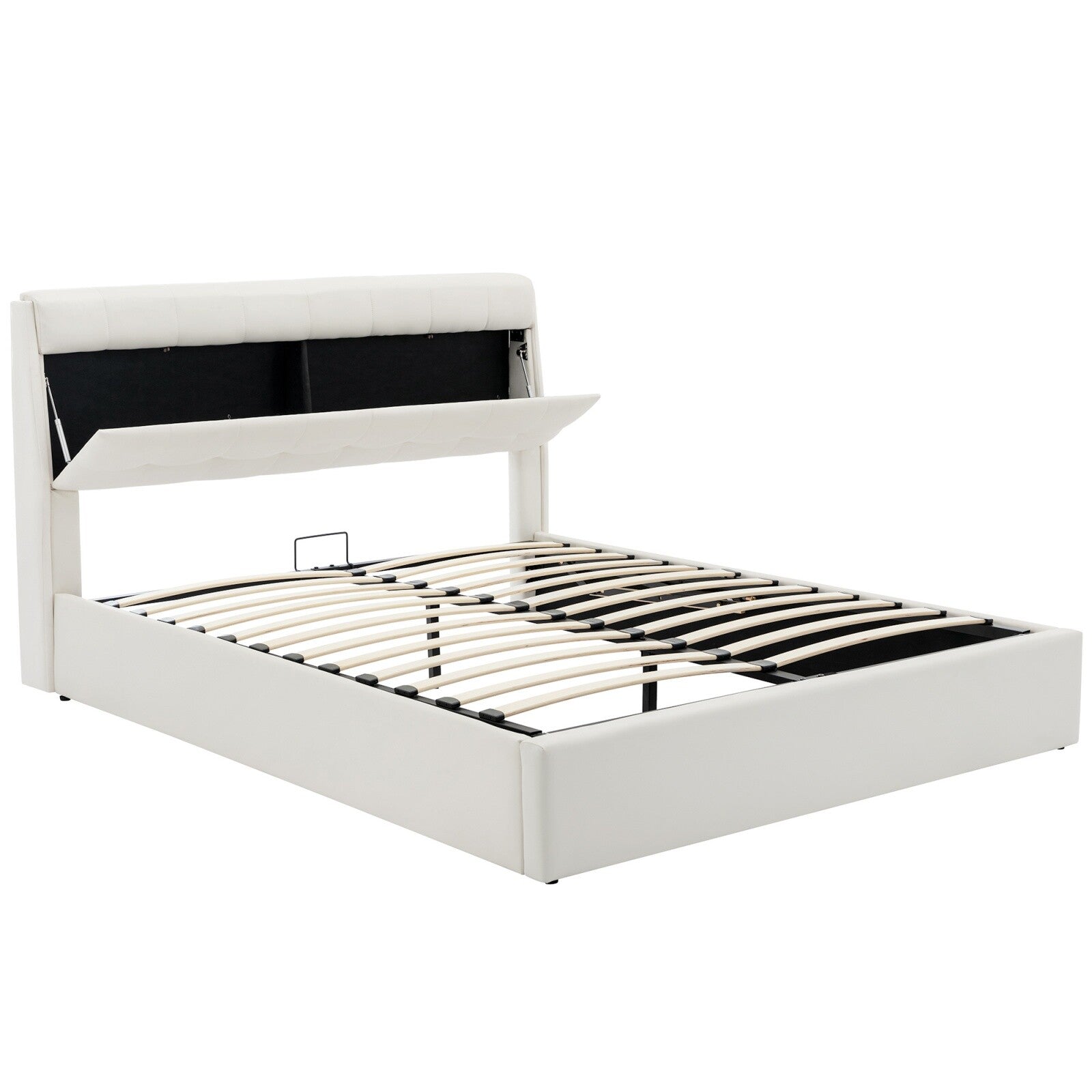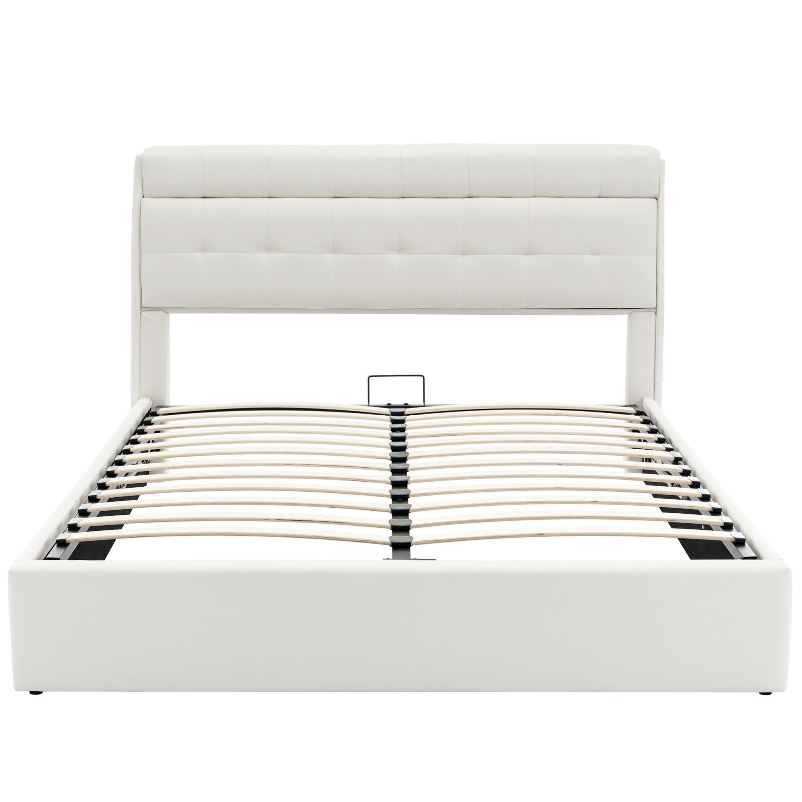 4ft6 Double Ottoman Gas Lift Up Upholstered Bed Frame W/ Storage Headboard Cream