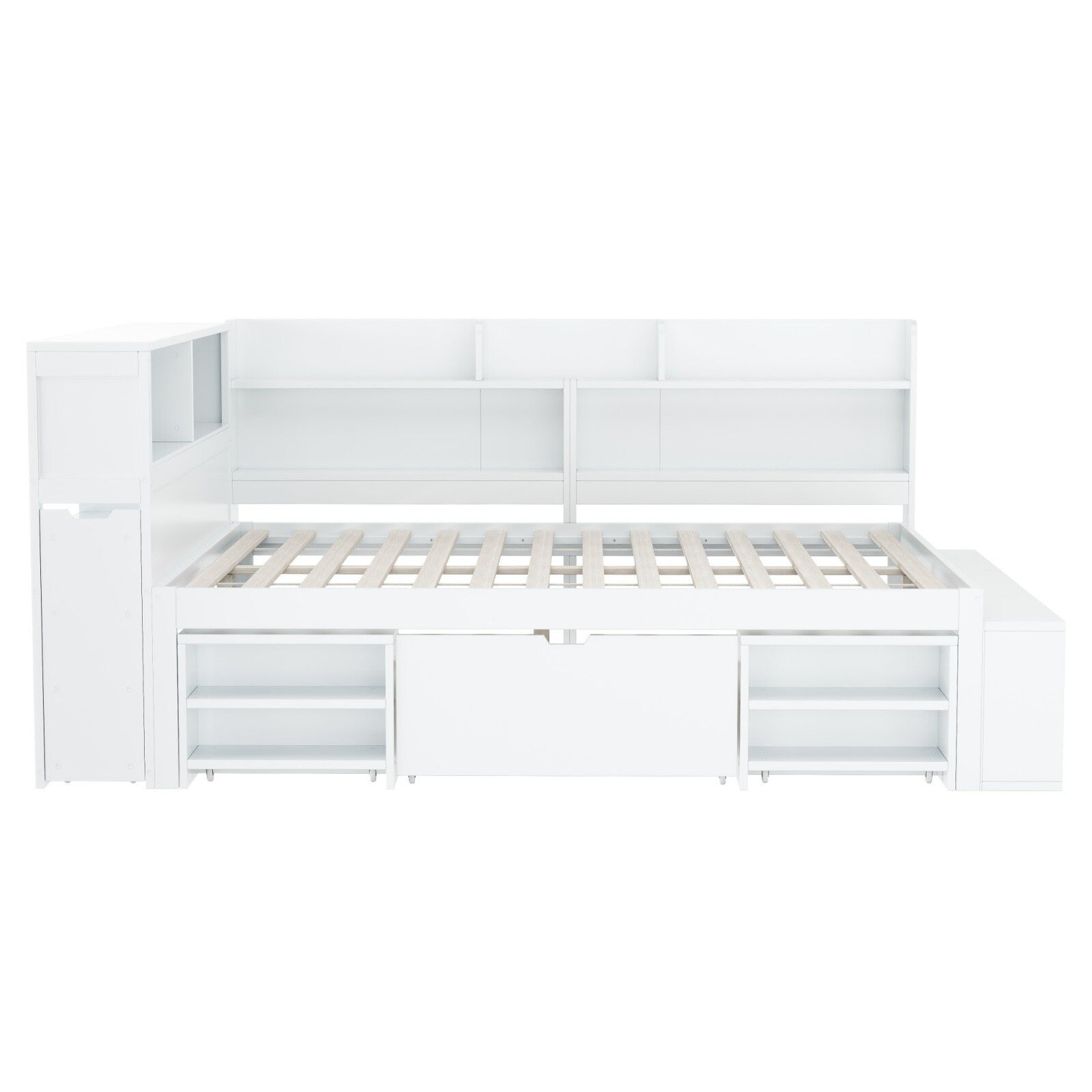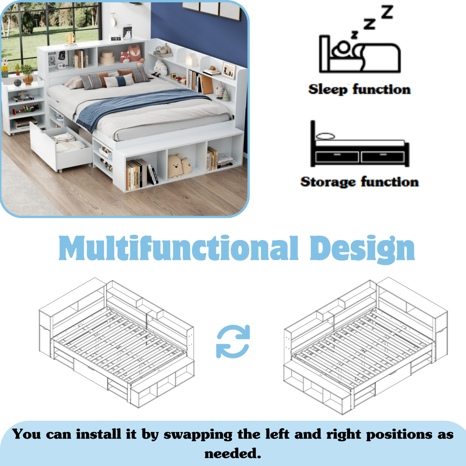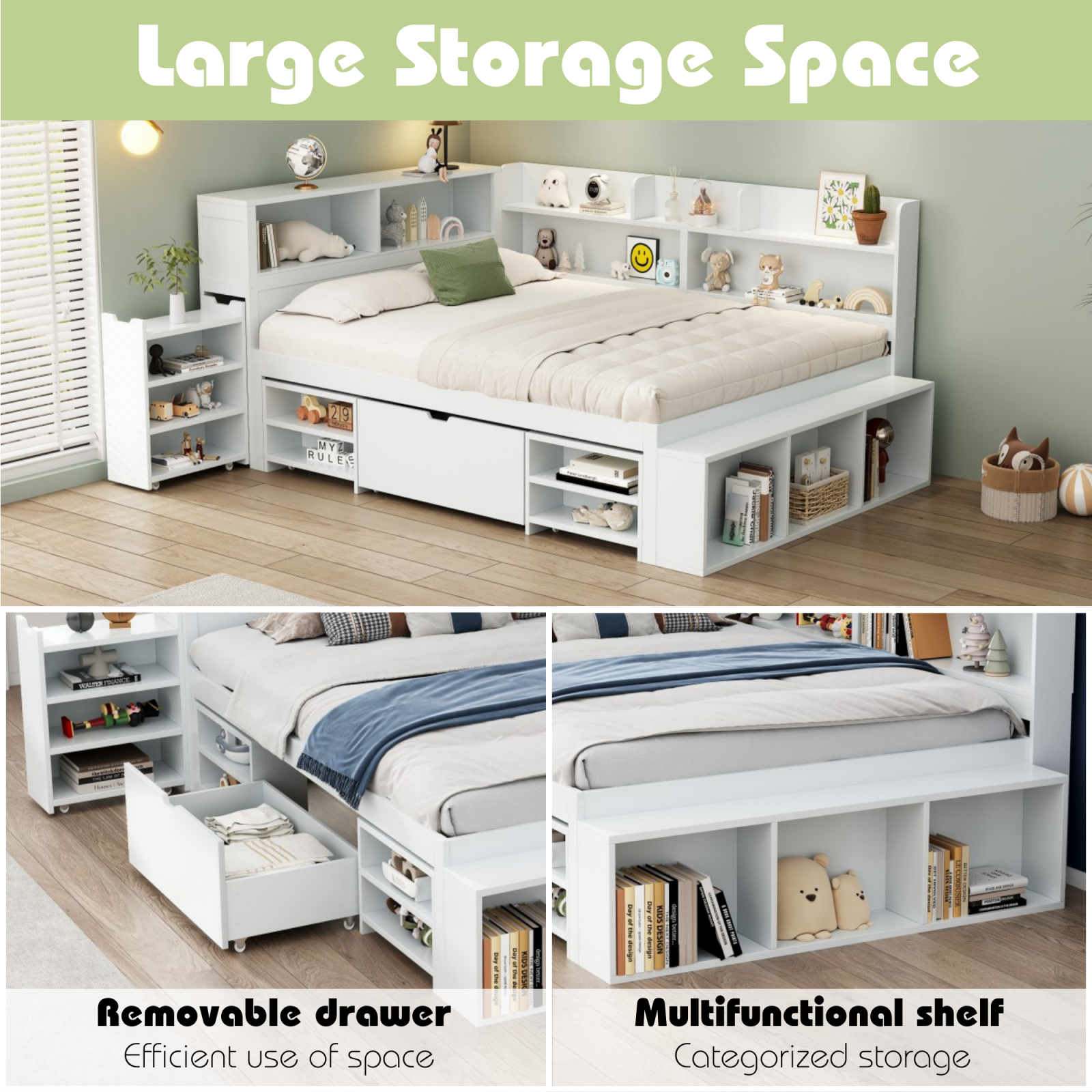 4FT6 DOUBLE WOODEN STORAGE BED FRAME WITH DRAWER AND CABINETS FOR KIDS TEENAGERS
